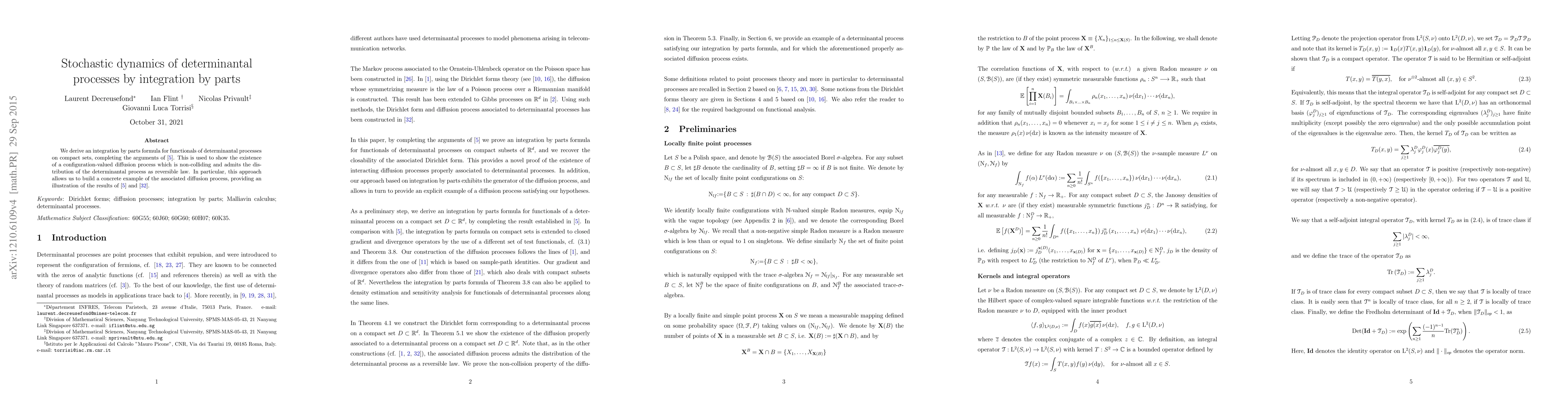 This paper derives an integration by parts formula for determinantal processes, completing previous arguments, and uses it to establish a non-colliding diffusion process with the determinantal process distribution, illustrating the results of prior studies.