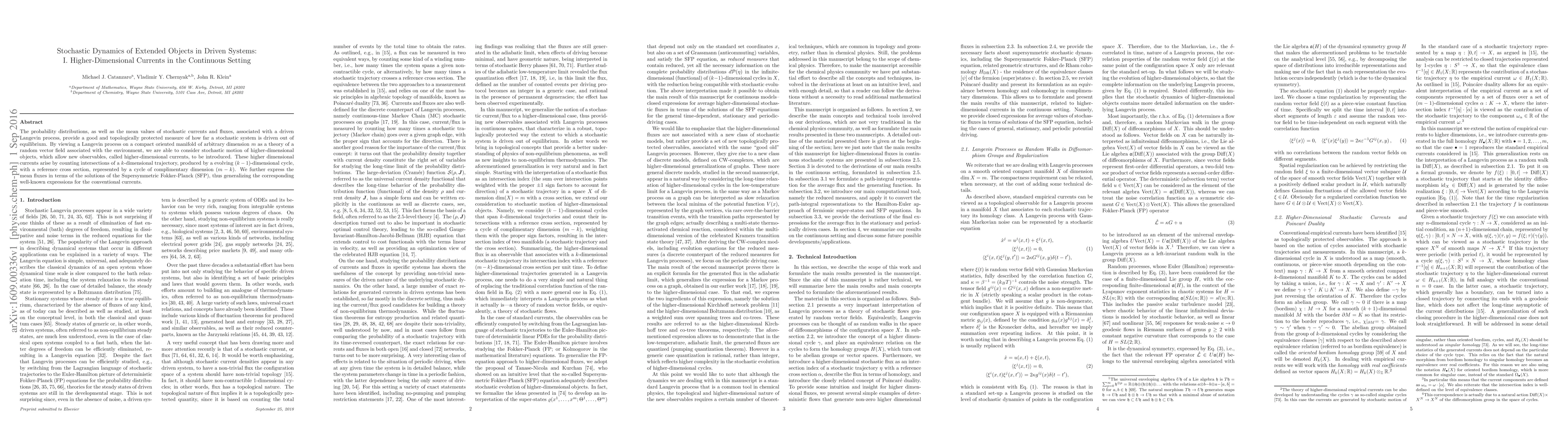 The probability distributions, as well as the mean values of stochastic currents and fluxes, associated with a driven Langevin process, provide a good and topologically protected measure of how far a stochastic system is driven out of equilibrium. By viewing a Langevin process on a compact oriented manifold of arbitrary dimension m as a theory of a random vector field associated with the environment, we are able to consider stochastic motion of higher-dimensional objects, which allow new observables, called higher-dimensional currents, to be introduced. These higher dimensional currents arise by counting intersections of a k-dimensional trajectory, produced by a evolving (k-1)-dimensional cycle, with a reference cross section, represented by a cycle of complimentary dimension (m - k). We further express the mean fluxes in terms of the solutions of the Supersymmetric Fokker-Planck (SFP), thus generalizing the corresponding well-known expressions for the conventional currents.