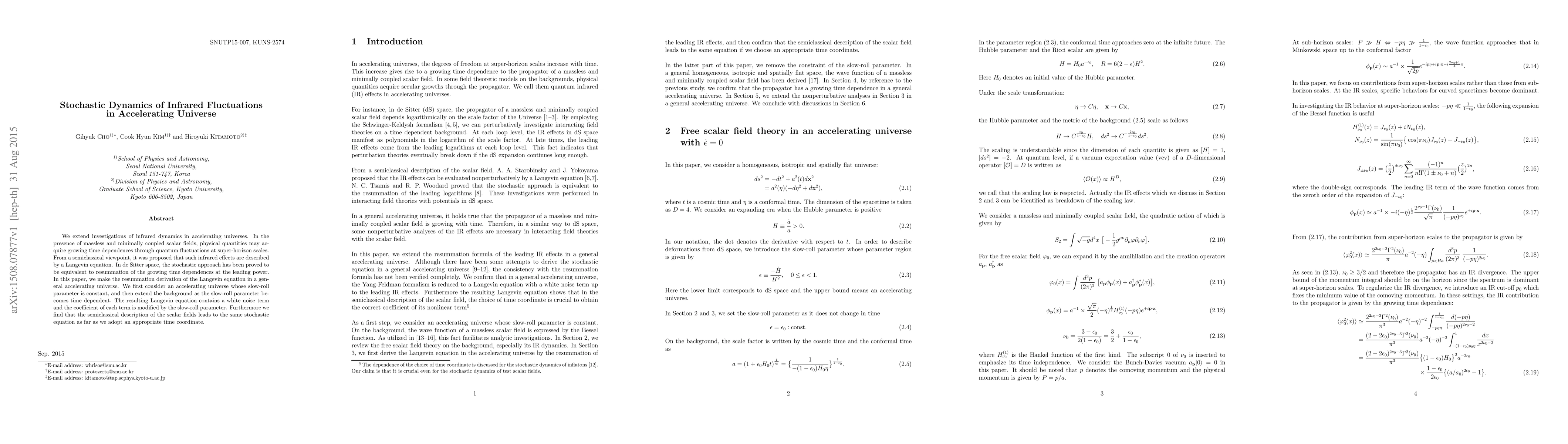 We extend investigations of infrared dynamics in accelerating universes. In the presence of massless and minimally coupled scalar fields, physical quantities may acquire growing time dependences through quantum fluctuations at super-horizon scales. From a semiclassical viewpoint, it was proposed that such infrared effects are described by a Langevin equation. In de Sitter space, the stochastic approach has been proved to be equivalent to resummation of the growing time dependences at the leading power. In this paper, we make the resummation derivation of the Langevin equation in a general accelerating universe. We first consider an accelerating universe whose slow-roll parameter is constant, and then extend the background as the slow-roll parameter becomes time dependent. The resulting Langevin equation contains a white noise term and the coefficient of each term is modified by the slow-roll parameter. Furthermore we find that the semiclassical description of the scalar fields leads to the same stochastic equation as far as we adopt an appropriate time coordinate.