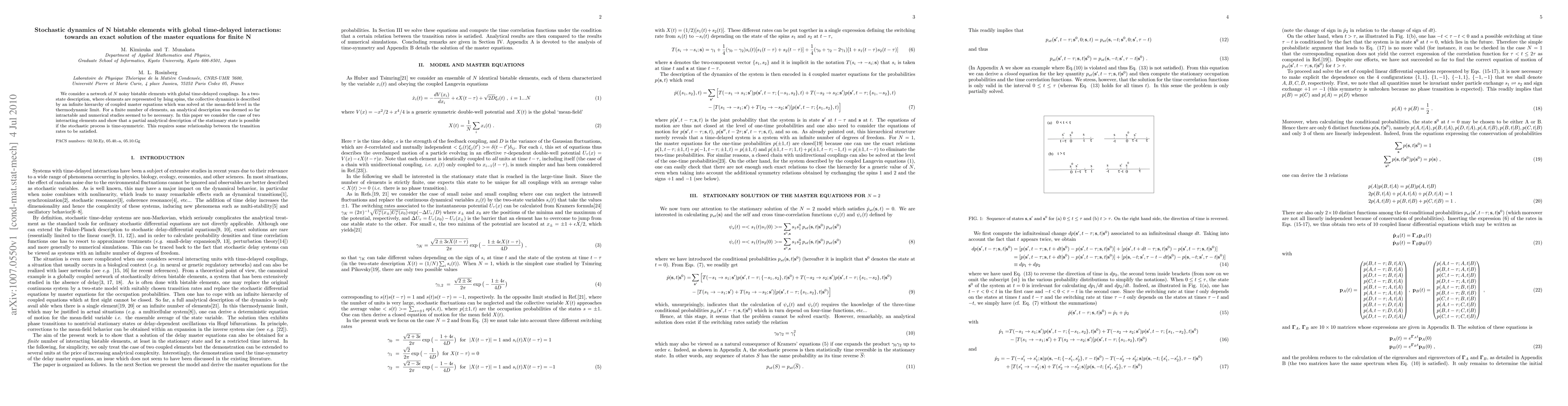 This paper investigates the stochastic dynamics of a network of N bistable elements with global time-delayed interactions, focusing on a two-state system modeled by Ising spins. For a finite N, the authors demonstrate that an exact analytical solution of the master equations is achievable for two interacting elements under time-symmetric stochastic processes.