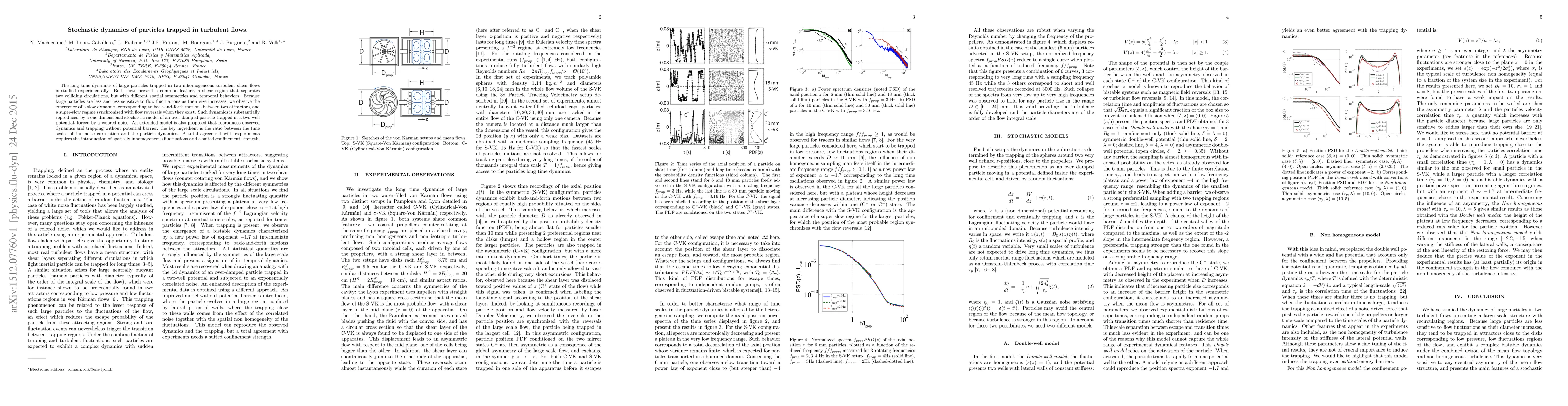 The long time dynamics of large particles trapped in two inhomogeneous turbulent shear flows is studied experimentally. Both flows present a common feature, a shear region that separates two colliding circulations, but with different spatial symmetries and temporal behaviors. Because large particles are less and less sensitive to flow fluctuations as their size increases, we observe the emergence of a slow dynamics corresponding to back-and-forth motions between two attractors, and a super-slow regime synchronized with flow reversals when they exist. Such dynamics is substantially reproduced by a one dimensional stochastic model of an over-damped particle trapped in a two-well potential, forced by a colored noise. An extended model is also proposed that reproduces observed dynamics and trapping without potential barrier: the key ingredient is the ratio between the time scales of the noise correlation and the particle dynamics. A total agreement with experiments requires the introduction of spatially inhomogeneous fluctuations and a suited confinement strength.