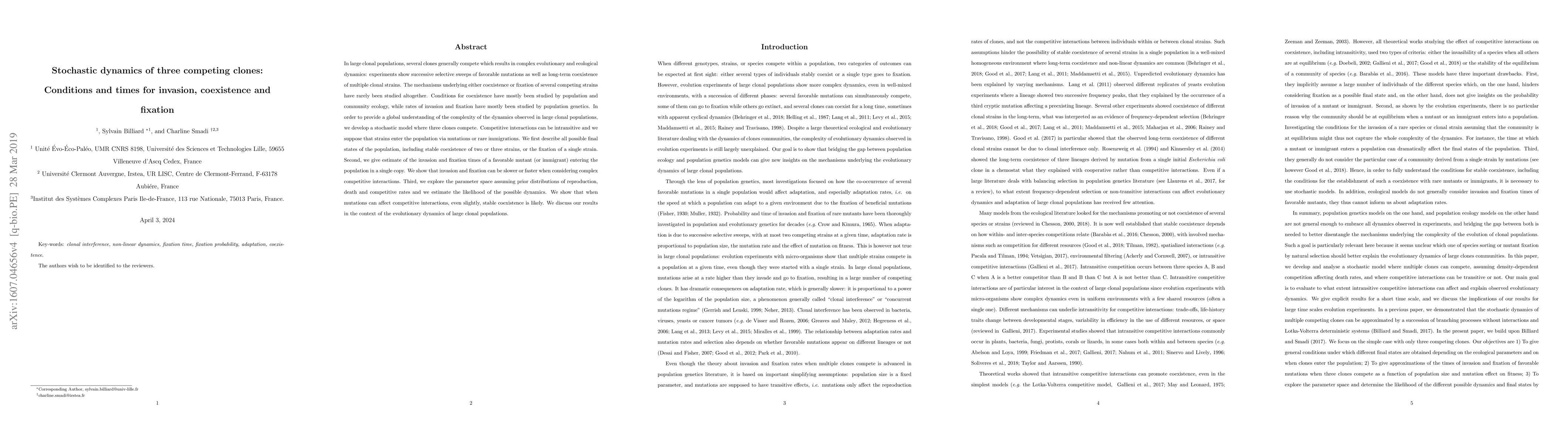This paper develops a stochastic model to analyze the dynamics of three competing clones, exploring conditions and times for invasion, coexistence, and fixation. It finds that complex competitive interactions can significantly influence these dynamics, and stable coexistence is likely when mutations affect competitive interactions.