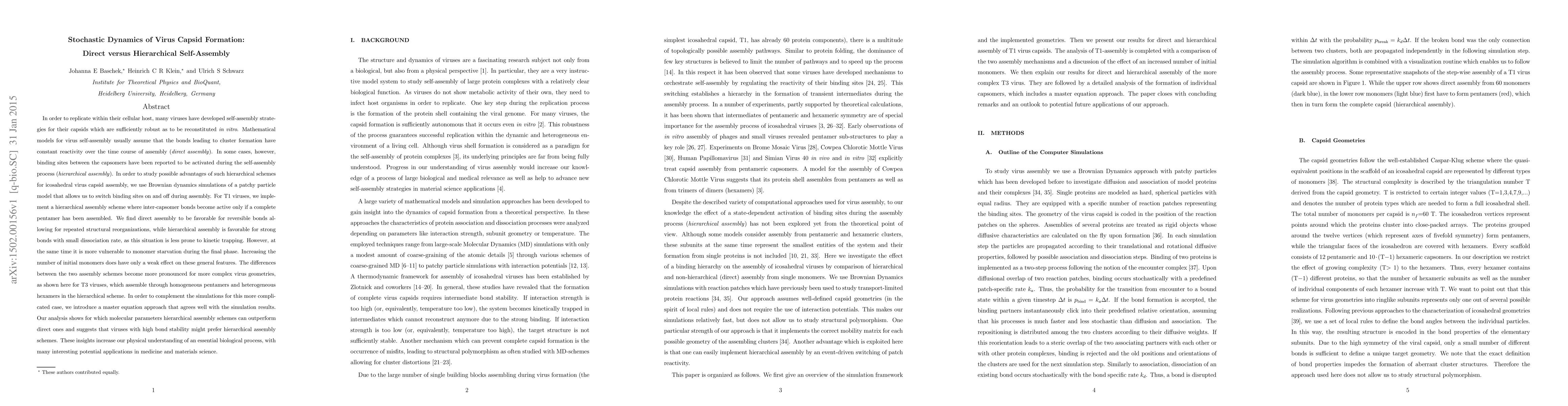This paper investigates the stochastic dynamics of virus capsid formation through direct and hierarchical self-assembly using Brownian dynamics simulations. It finds that direct assembly is advantageous for reversible bonds, while hierarchical assembly, where binding sites activate during assembly, is more effective for strong bonds, though it risks monomer starvation. The study highlights differences in assembly schemes for simpler versus more complex virus geometries.