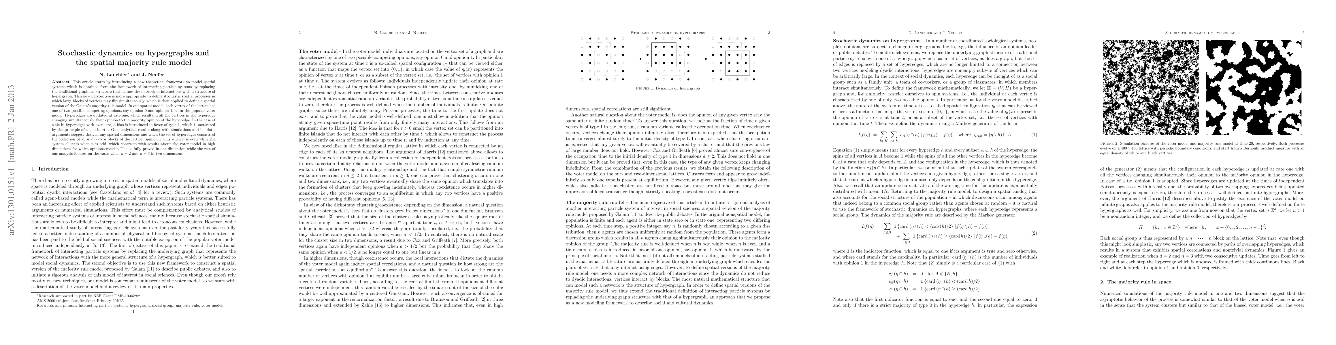 Researchers developed a new framework to model spatial systems using hypergraphs, which better represents large blocks of vertices flipping simultaneously. In this framework, opinion 1 wins in even dimensions, while the system clusters in odd dimensions, contrasting with previous results in high-dimensional voter models.