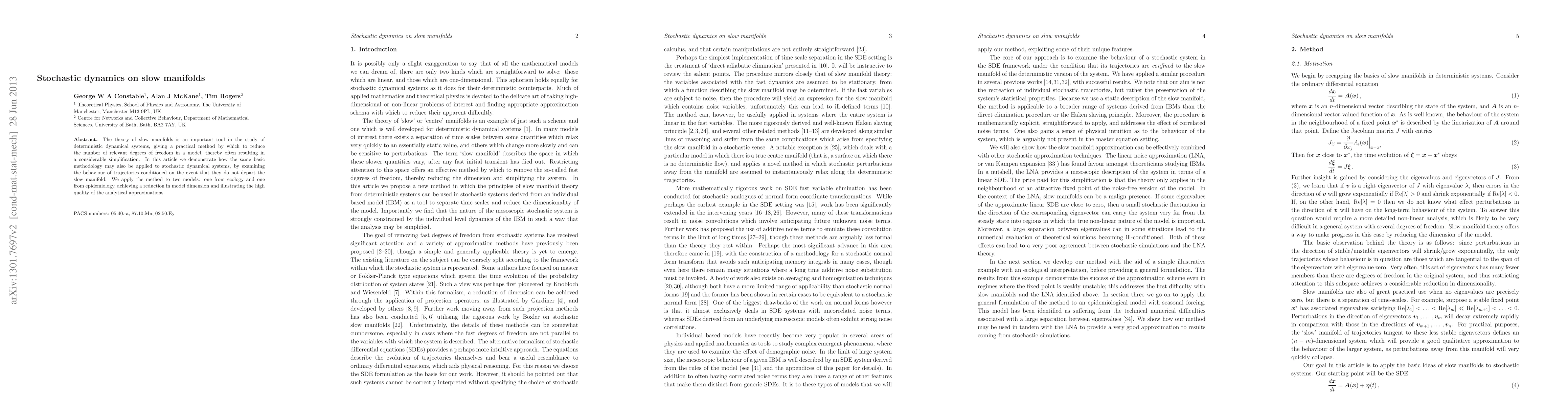 The theory of slow manifolds is an important tool in the study of deterministic dynamical systems, giving a practical method by which to reduce the number of relevant degrees of freedom in a model, thereby often resulting in a considerable simplification. In this article we demonstrate how the same basic methodology may also be applied to stochastic dynamical systems, by examining the behaviour of trajectories conditioned on the event that they do not depart the slow manifold. We apply the method to two models: one from ecology and one from epidemiology, achieving a reduction in model dimension and illustrating the high quality of the analytical approximations.