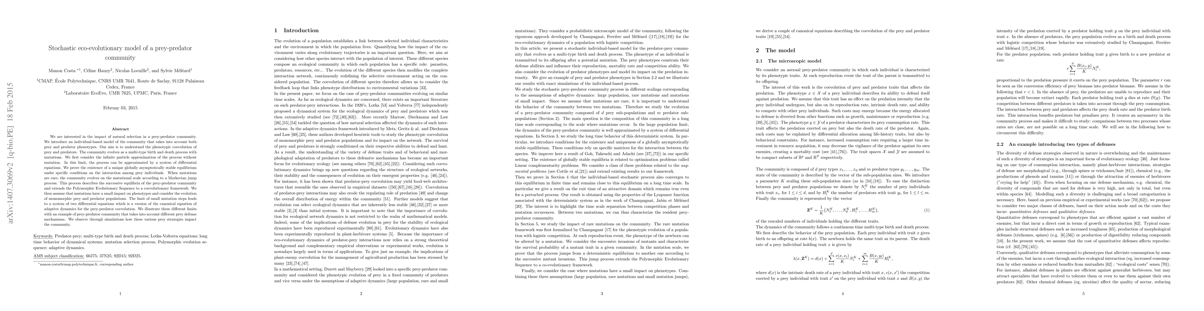 This paper develops a stochastic eco-evolutionary model to study the coevolution of prey and predator populations, demonstrating the existence of a stable equilibrium and exploring the impact of mutations on community dynamics through differential and Markovian processes. Simulations reveal how different prey defense mechanisms influence the evolutionary trajectory of the community.