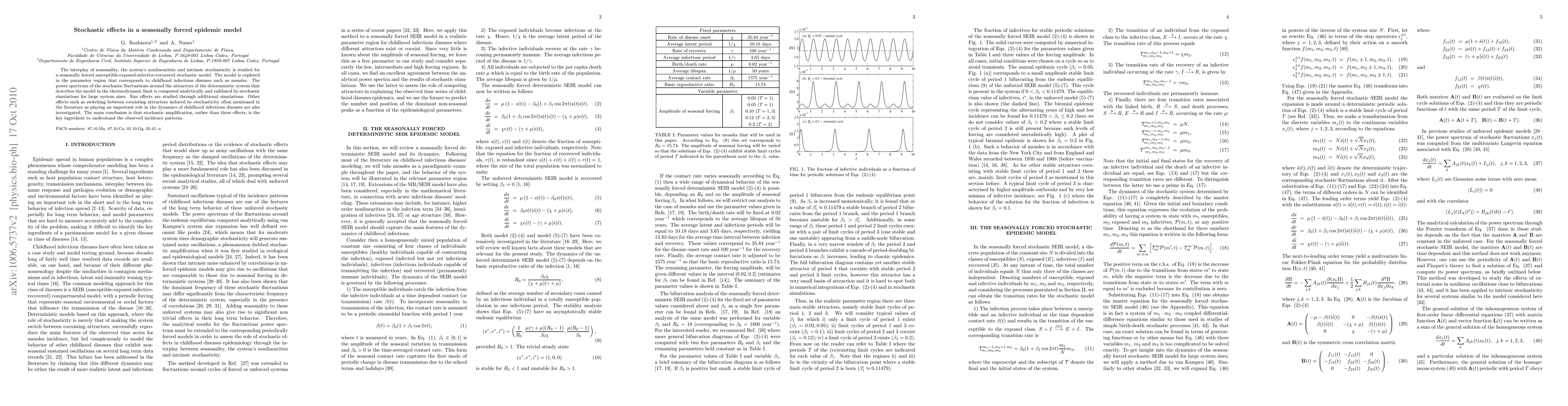 The interplay of seasonality, the system's nonlinearities and intrinsic stochasticity is studied for a seasonally forced susceptible-exposed-infective-recovered stochastic model. The model is explored in the parameter region that corresponds to childhood infectious diseases such as measles. The power spectrum of the stochastic fluctuations around the attractors of the deterministic system that describes the model in the thermodynamic limit is computed analytically and validated by stochastic simulations for large system sizes. Size effects are studied through additional simulations. Other effects such as switching between coexisting attractors induced by stochasticity often mentioned in the literature as playing an important role in the dynamics of childhood infectious diseases are also investigated. The main conclusion is that stochastic amplification, rather than these effects, is the key ingredient to understand the observed incidence patterns.