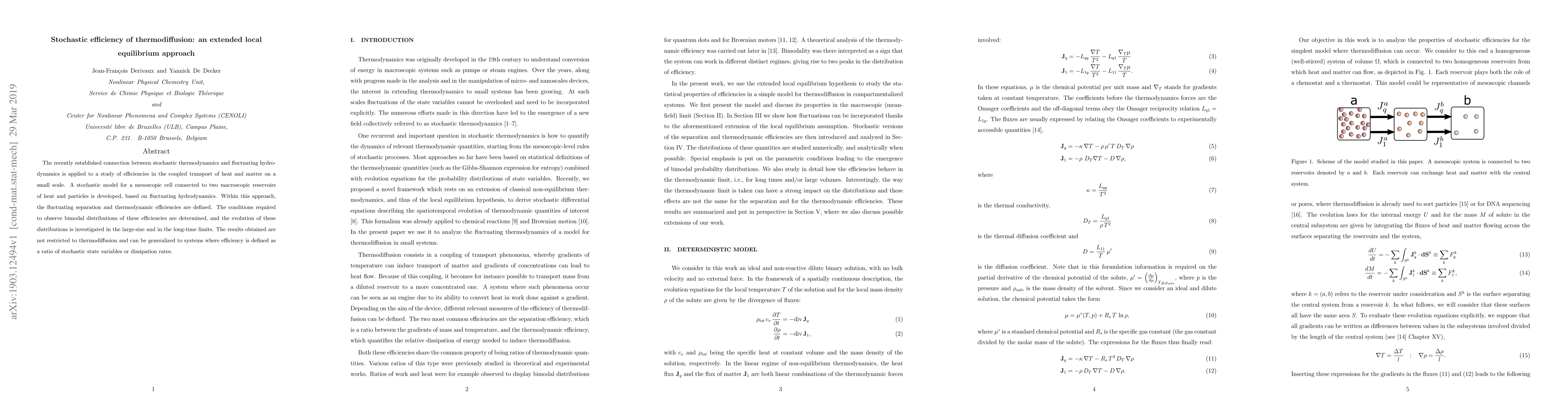 The recently established connection between stochastic thermodynamics and fluctuating hydrodynamics is applied to a study of efficiencies in the coupled transport of heat and matter on a small scale. A stochastic model for a mesoscopic cell connected to two macroscopic reservoirs of heat and particles is developed, based on fluctuating hydrodynamics. Within this approach, the fluctuating separation and thermodynamic efficiencies are defined. The conditions required to observe bimodal distributions of these efficiencies are determined, and the evolution of these distributions is investigated in the large-size and in the long-time limits. The results obtained are not restricted to thermodiffusion and can be generalized to systems where efficiency is defined as a ratio of stochastic state variables or dissipation rates.
