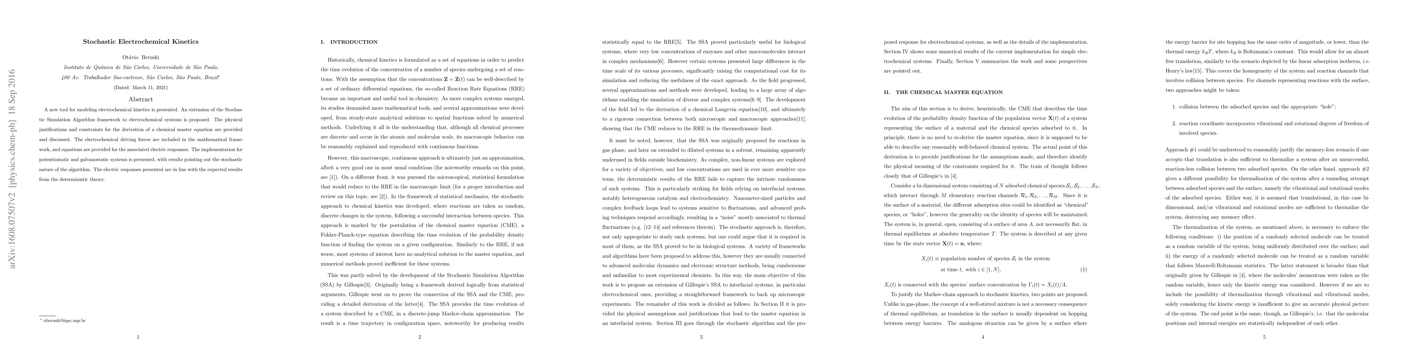 This paper introduces a new stochastic modeling tool for electrochemical kinetics, extending the Stochastic Simulation Algorithm to electrochemical systems. It provides a chemical master equation with electrochemical driving forces and electric responses, validated for potentiostatic and galvanostatic systems, demonstrating the stochastic nature of the algorithm.