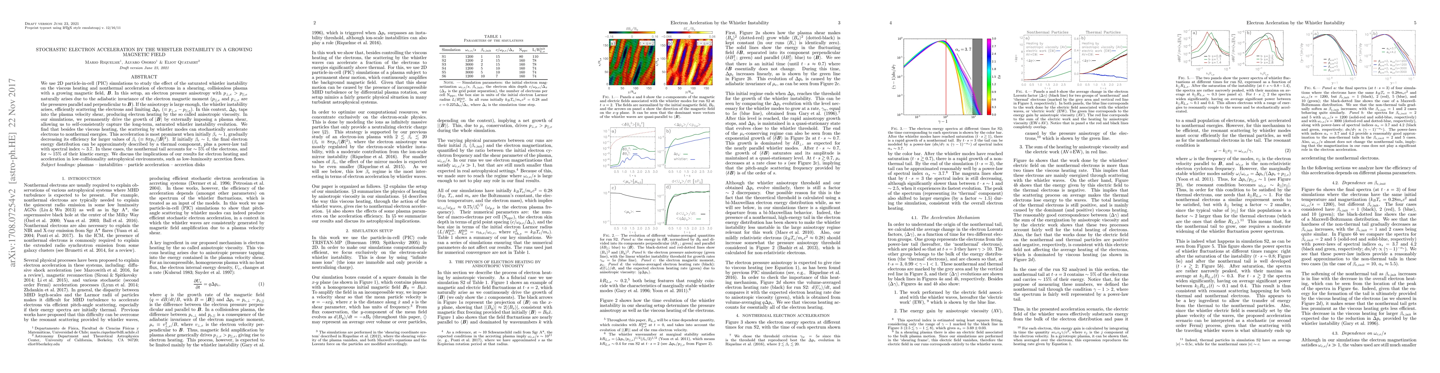 This paper investigates the stochastic acceleration of electrons by the whistler instability in a growing magnetic field using 2D PIC simulations. The study finds that the whistler instability can lead to both viscous heating and nonthermal acceleration of electrons in a shearing plasma, with the latter being most effective when initial $\beta_e \sim 1$. The final electron energy distribution includes a thermal component and a nonthermal power-law tail, with implications for electron dynamics in astrophysical environments.