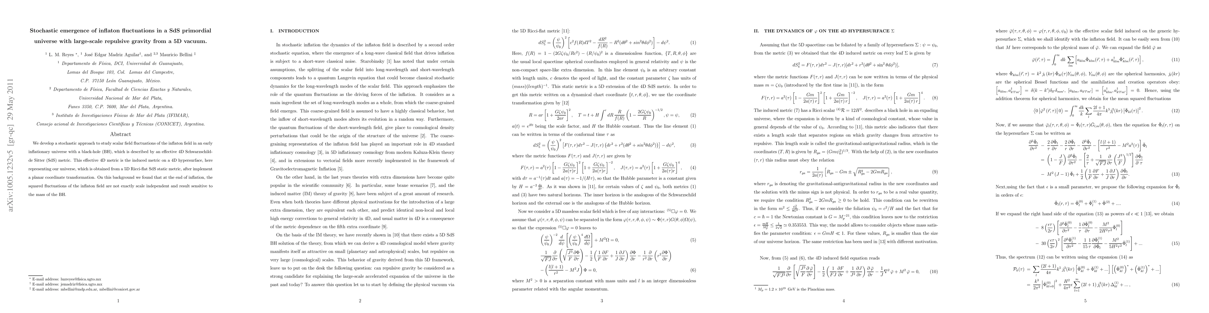 This paper develops a stochastic method to analyze inflaton field fluctuations in an early inflationary universe with a black hole, described by a 4D SdS metric derived from a 5D Ricci-flat SdS static metric. It finds that the squared fluctuations of the inflaton field are scale-dependent and influenced by the black hole's mass at the end of inflation.