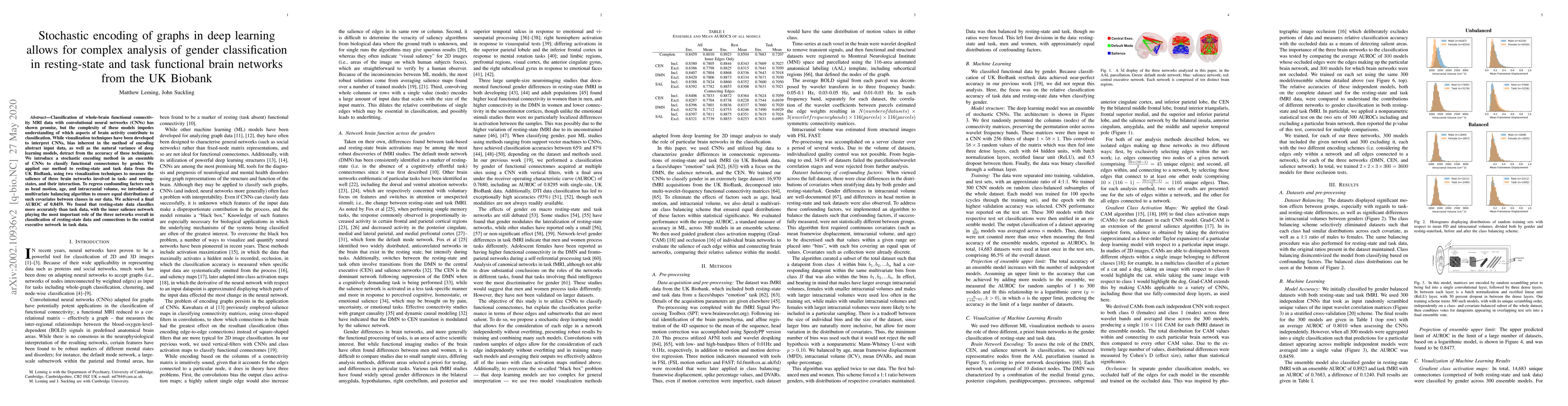 Classification of whole-brain functional connectivity MRI data with convolutional neural networks (CNNs) has shown promise, but the complexity of these models impedes understanding of which aspects of brain activity contribute to classification. While visualization techniques have been developed to interpret CNNs, bias inherent in the method of encoding abstract input data, as well as the natural variance of deep learning models, detract from the accuracy of these techniques. We introduce a stochastic encoding method in an ensemble of CNNs to classify functional connectomes by gender. We applied our method to resting-state and task data from the UK BioBank, using two visualization techniques to measure the salience of three brain networks involved in task- and resting-states, and their interaction. To regress confounding factors such as head motion, age, and intracranial volume, we introduced a multivariate balancing algorithm to ensure equal distributions of such covariates between classes in our data. We achieved a final AUROC of 0.8459. We found that resting-state data classifies more accurately than task data, with the inner salience network playing the most important role of the three networks overall in classification of resting-state data and connections to the central executive network in task data.