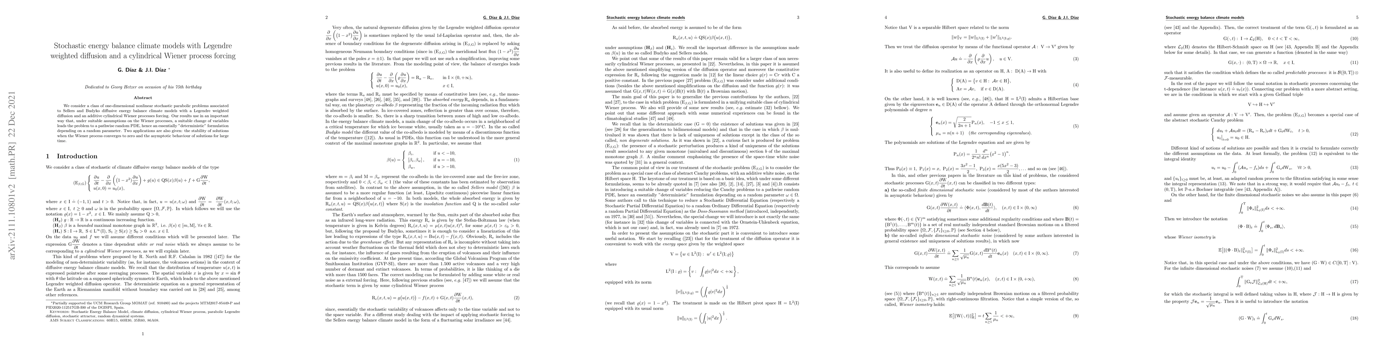 This paper explores one-dimensional stochastic parabolic problems related to energy balance climate models, incorporating Legendre weighted diffusion and cylindrical Wiener process forcing. It demonstrates a transformation that converts the stochastic problem into a pathwise random PDE, facilitating analysis of solution stability and long-term behavior.