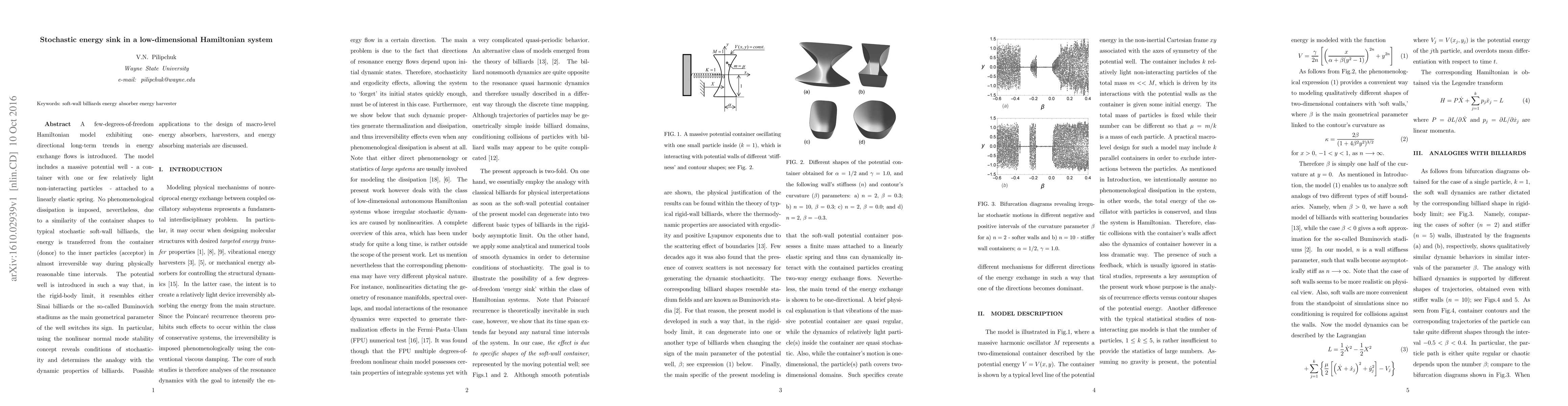 A few-degrees-of-freedom Hamiltonian model exhibiting one-directional long-term trends in energy exchange flows is introduced. The model includes a massive potential well - a container with one or few relatively light non-interacting particles \ - attached to a linearly elastic spring. No phenomenological dissipation is imposed, nevertheless, due to a similarity of the container shapes to typical stochastic soft-wall billiards, the energy is transferred from the container (donor) to the inner particles (acceptor) in almost irreversible way during physically reasonable time intervals. The potential well is introduced in such a way that, in the rigid-body limit, it resembles either Sinai billiards or the so-called Buminovich stadiums as the main geometrical parameter of the well switches its sign. In particular, using the nonlinear normal mode stability concept reveals conditions of stochasticity and determines the analogy with the dynamic properties of billiards. Possible applications to the design of macro-level energy absorbers, harvesters, and energy absorbing materials are discussed.