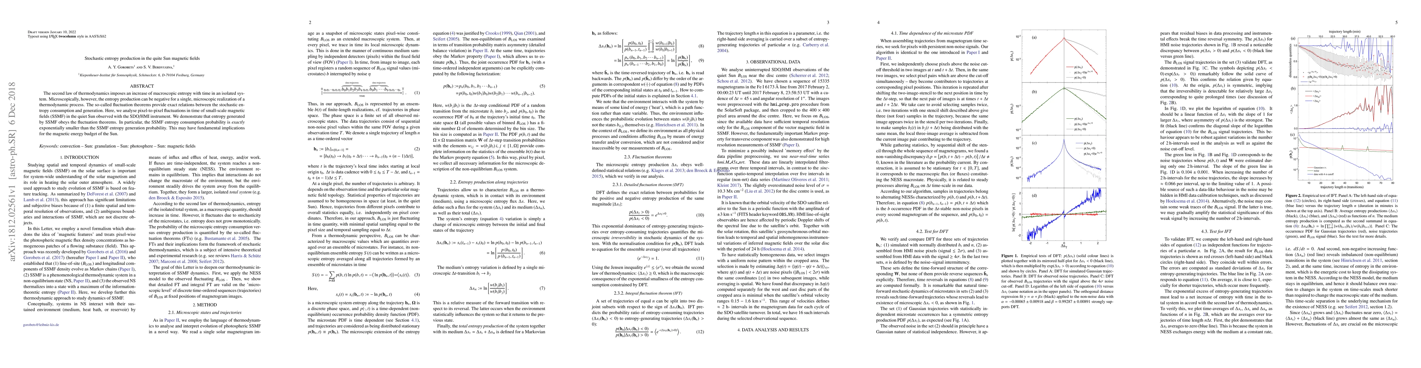 The second law of thermodynamics imposes an increase of macroscopic entropy with time in an isolated system. Microscopically, however, the entropy production can be negative for a single, microscopic realization of a thermodynamic process. The so-called fluctuation theorems provide exact relations between the stochastic entropy consumption and generation. Here, we analyse pixel-to-pixel fluctuations in time of small-scale magnetic fields (SSMF) in the quiet Sun observed with the SDO/HMI instrument. We demonstrate that entropy generated by SSMF obeys the fluctuation theorems. In particular, the SSMF entropy consumption probability is exactly exponentially smaller than the SSMF entropy generation probability. This may have fundamental implications for the magnetic energy budget of the Sun.