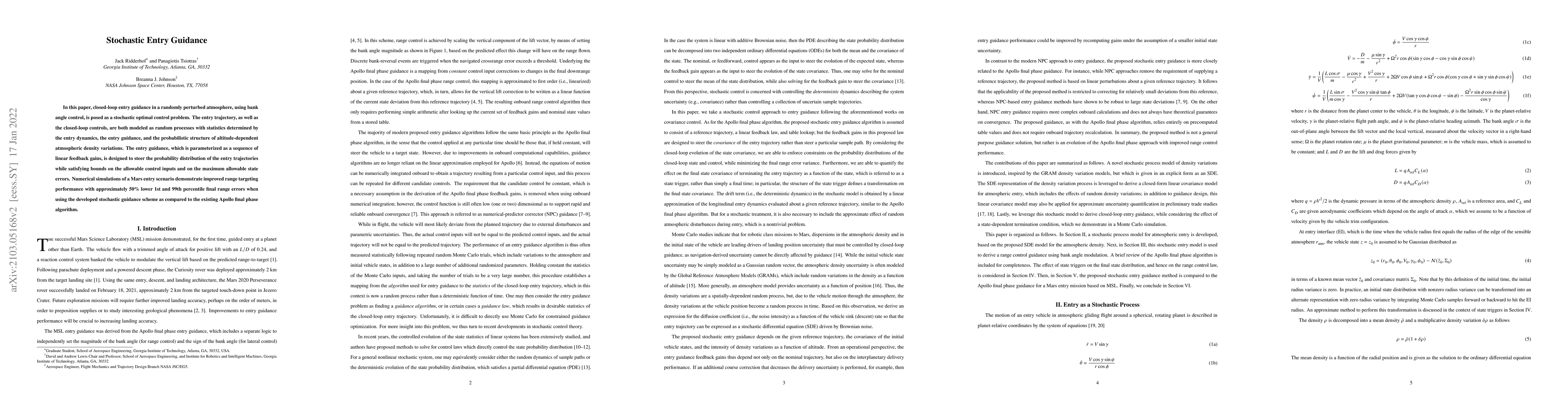 This paper presents a new method for space entry guidance that uses stochastic control to minimize final range errors. Numerical simulations show significant improvements over existing algorithms, with 50% lower error rates in a Mars entry scenario.
