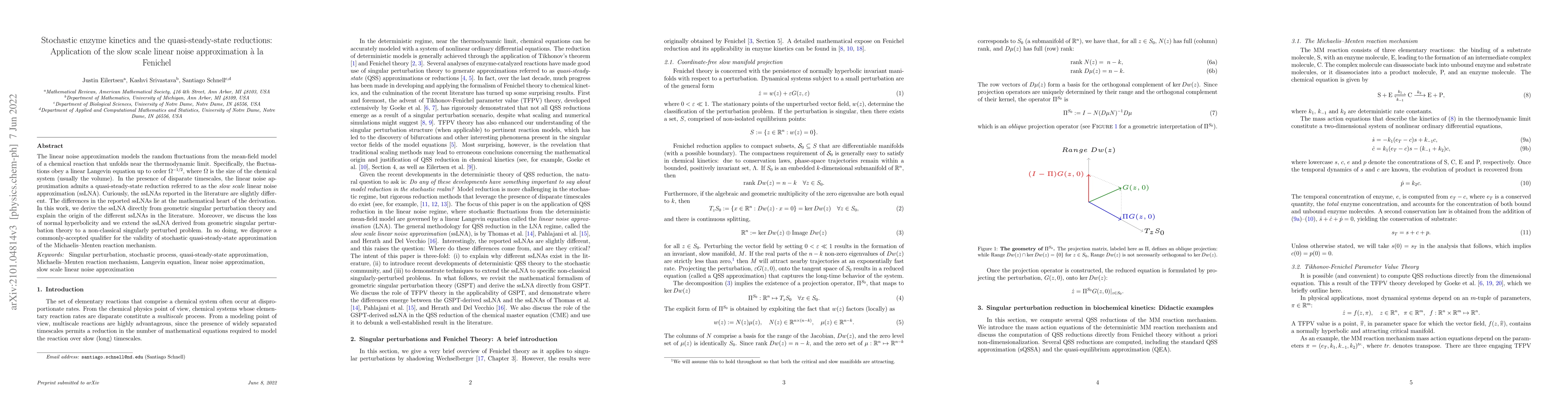 The linear noise approximation models the random fluctuations from the mean-field model of a chemical reaction that unfolds near the thermodynamic limit. Specifically, the fluctuations obey a linear Langevin equation up to order $\Omega^{-1/2}$, where $\Omega$ is the size of the chemical system (usually the volume). In the presence of disparate timescales, the linear noise approximation admits a quasi-steady-state reduction referred to as the \textit{slow scale} linear noise approximation (ssLNA). Curiously, the ssLNAs reported in the literature are slightly different. The differences in the reported ssLNAs lie at the mathematical heart of the derivation. In this work, we derive the ssLNA directly from geometric singular perturbation theory and explain the origin of the different ssLNAs in the literature. Moreover, we discuss the loss of normal hyperbolicity and we extend the ssLNA derived from geometric singular perturbation theory to a non-classical singularly perturbed problem. In so doing, we disprove a commonly-accepted qualifier for the validity of stochastic quasi-steady-state approximation of the Michaelis--Menten reaction mechanism.