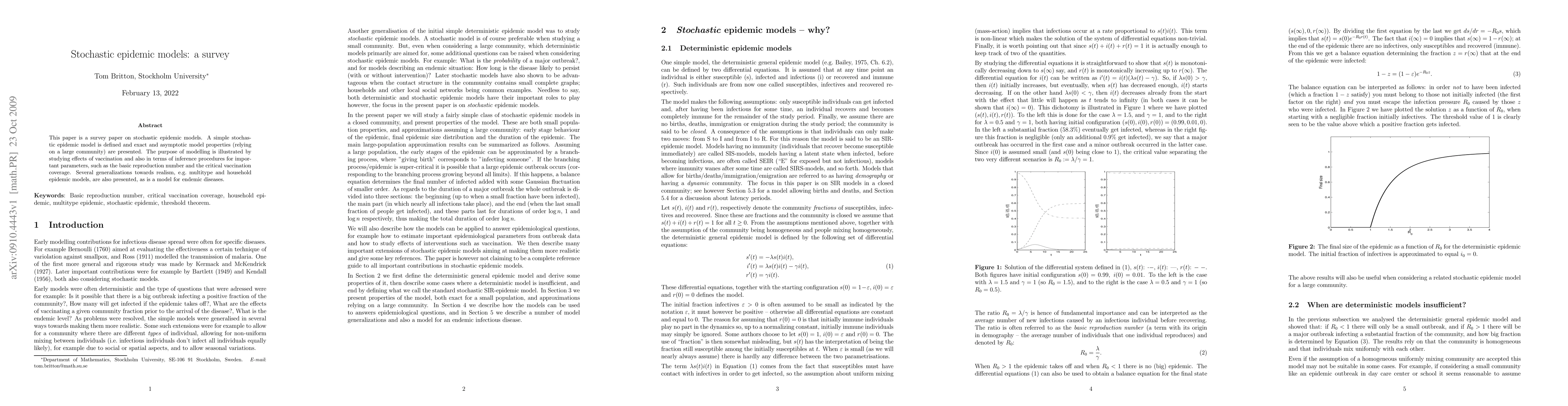 This survey paper explores stochastic epidemic models, detailing simple models and their properties, and examines the impact of vaccination and parameter inference. It also discusses extensions like multitype and household models, and endemic disease modeling.
