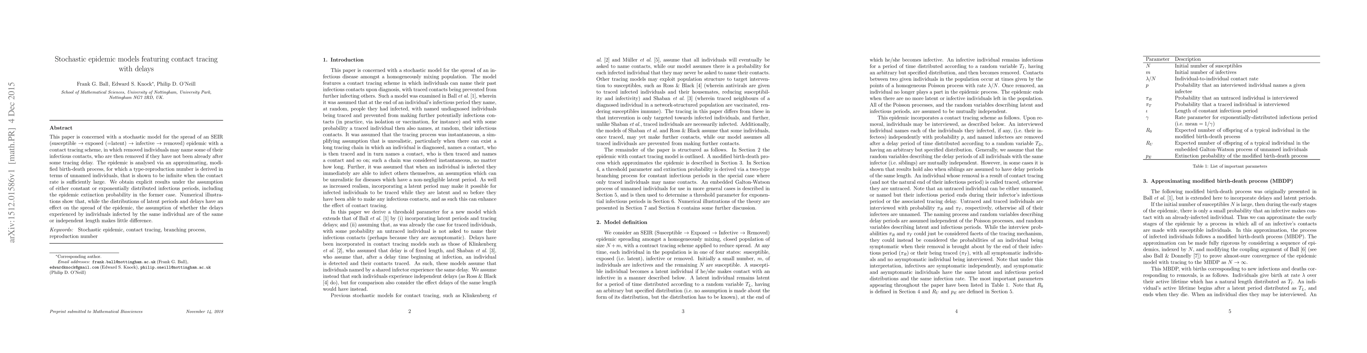 This paper explores a stochastic SEIR model for epidemic spread with contact tracing delays, analyzing it through a modified birth-death process. The study finds that the type-reproduction number is infinite when the contact rate is high, and it provides explicit results for constant or exponentially distributed infectious periods, showing minimal impact from the nature of delays on epidemic spread.