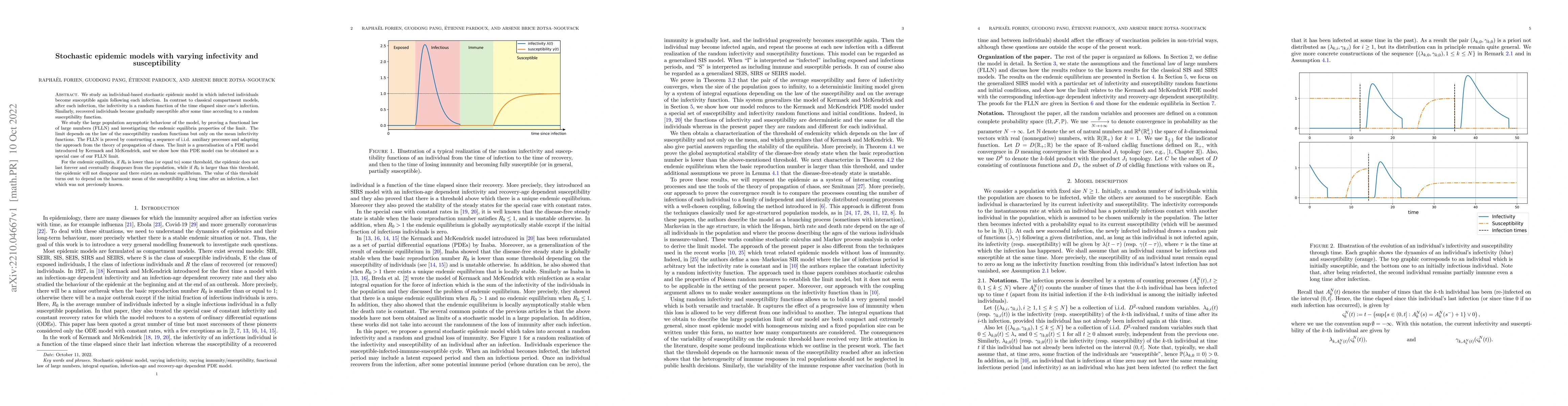 We study an individual-based stochastic epidemic model in which infected individuals become susceptible again following each infection. In contrast to classical compartment models, after each infection, the infectivity is a random function of the time elapsed since one's infection. Similarly, recovered individuals become gradually susceptible after some time according to a random susceptibility function. We study the large population asymptotic behaviour of the model, by proving a functional law of large numbers (FLLN) and investigating the endemic equilibria properties of the limit. The limit depends on the law of the susceptibility random functions but only on the mean infectivity functions. The FLLN is proved by constructing a sequence of i.i.d. auxiliary processes and adapting the approach from the theory of propagation of chaos. The limit is a generalisation of a PDE model introduced by Kermack and McKendrick, and we show how this PDE model can be obtained as a special case of our FLLN limit.% for a particular set of infectivity and susceptibility random functions and initial conditions. For the endemic equilibria, if $ R_0 $ is lower than (or equal to) some threshold, the epidemic does not last forever and eventually disappears from the population, while if $ R_0 $ is larger than this threshold, the epidemic will not disappear and there exists an endemic equilibrium. The value of this threshold turns out to depend on the harmonic mean of the susceptibility a long time after an infection, a fact which was not previously known.