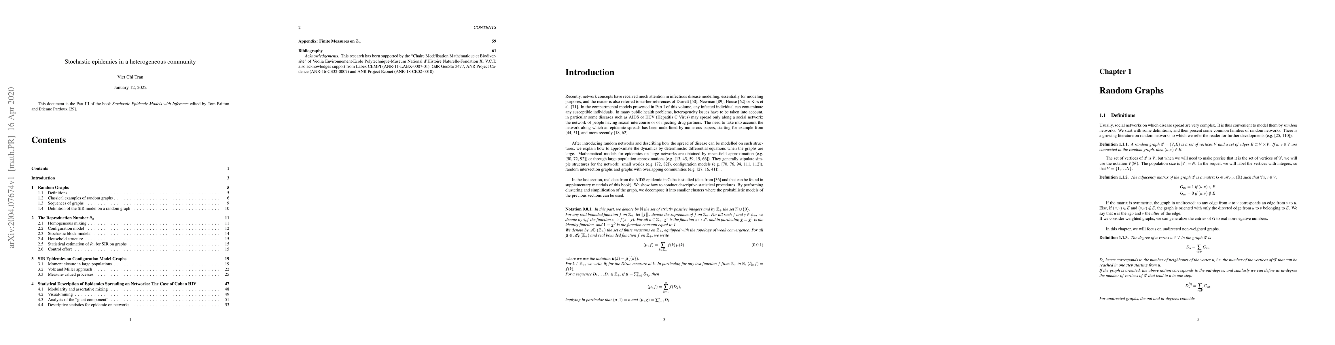 This chapter explores stochastic epidemic models in heterogeneous communities, focusing on random graphs, the reproduction number R0, SIR epidemics on configuration model graphs, and the statistical description of HIV epidemics in Cuban networks.