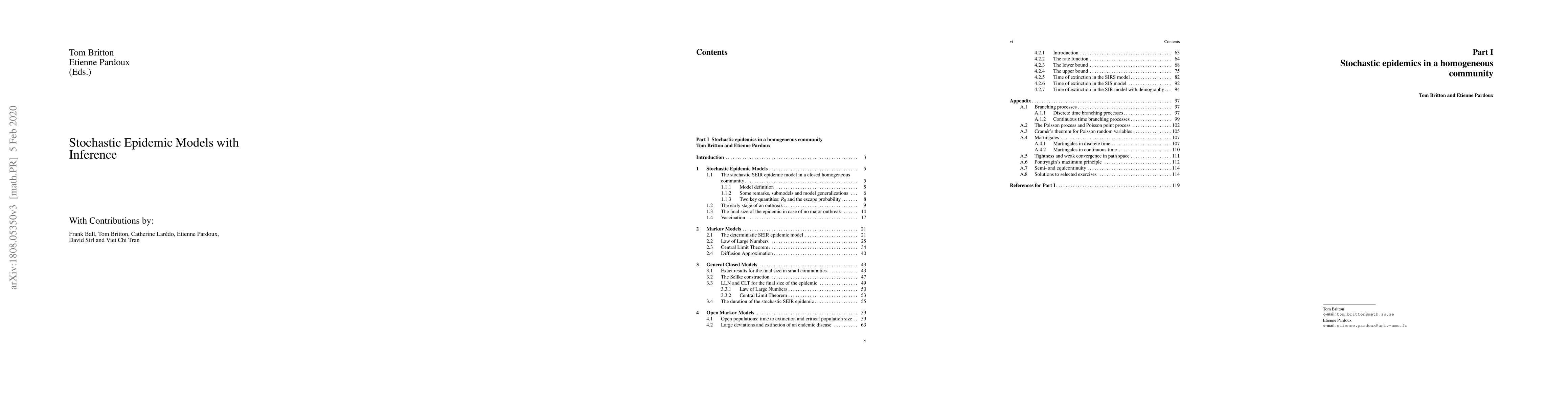 These notes describe stochastic epidemics in a homogenous community. Our main concern is stochastic compartmental models (i.e. models where each individual belongs to a compartment, which stands for its status regarding the epidemic under study : S for susceptible, E for exposed, I for infectious, R for recovered) for the spread of an infectious disease. In the present notes we restrict ourselves to homogeneously mixed communities. We present our general model and study the early stage of the epidemic in chapter 1. Chapter 2 studies the particular case of Markov models, especially in the asymptotic of a large population, which leads to a law of large numbers and a central limit theorem. Chapter 3 considers the case of a closed population, and describes the final size of the epidemic (i.e. the total number of individuals who ever get infected). Chapter 4 considers models with a constant influx of susceptibles (either by birth, immigration of loss of immunity of recovered individuals), and exploits the CLT and Large Deviations to study how long it takes for the stochastic disturbances to stop an endemic situation which is stable for the deterministic epidemic model. The document ends with an Appendix which presents several mathematical notions which are used in these notes, as well as solutions to many of the exercises which are proposed in the various chapters.