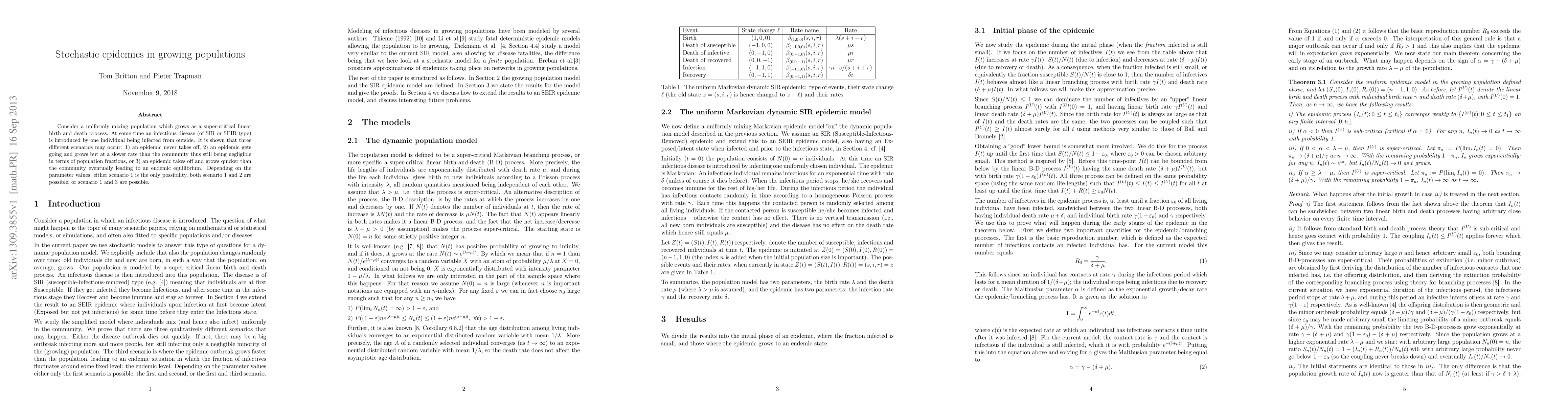 Consider a uniformly mixing population which grows as a super-critical linear birth and death process. At some time an infectious disease (of SIR or SEIR type) is introduced by one individual being infected from outside. It is shown that three different scenarios may occur: 1) an epidemic never takes off, 2) an epidemic gets going and grows but at a slower rate than the community thus still being negligible in terms of population fractions, or 3) an epidemic takes off and grows quicker than the community eventually leading to an endemic equilibrium. Depending on the parameter values, either scenario 1 is the only possibility, both scenario 1 and 2 are possible, or scenario 1 and 3 are possible.