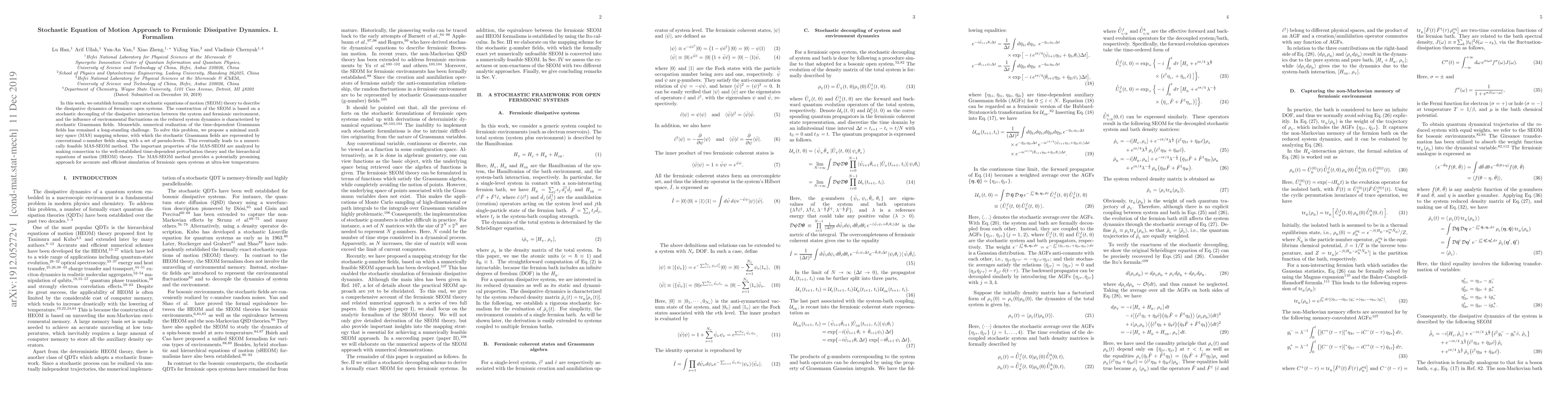 This paper introduces a formalism for stochastic equations of motion (SEOM) to describe dissipative dynamics in fermionic open systems, employing a stochastic decoupling approach. It proposes a minimal auxiliary space (MAS) mapping scheme to numerically represent stochastic Grassmann fields, leading to a feasible MAS-SEOM method for simulating such systems at ultra-low temperatures.