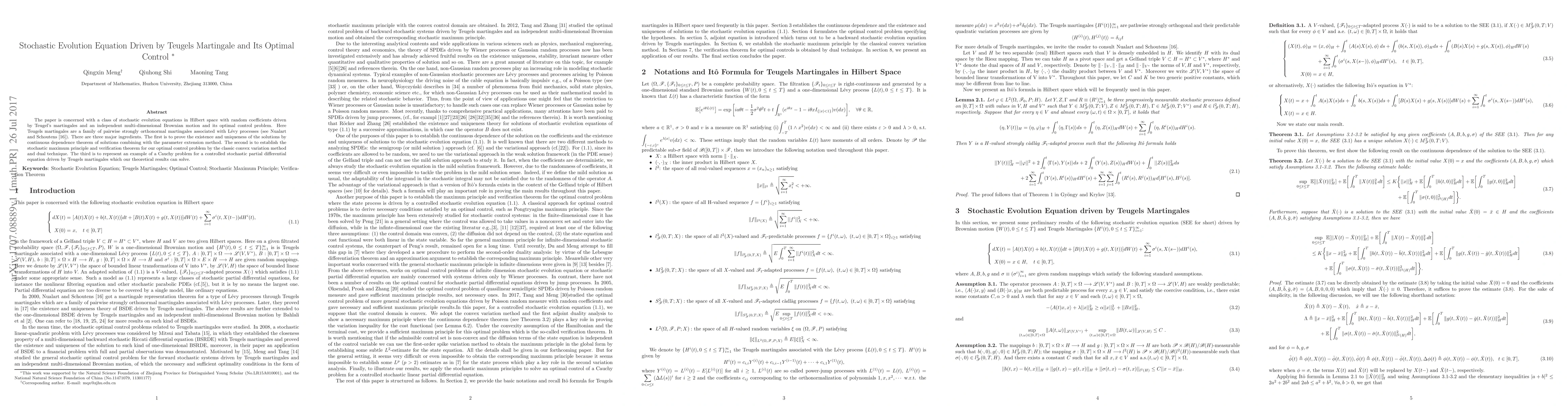 This paper investigates stochastic evolution equations in Hilbert space driven by Teugels martingales and Brownian motion, focusing on their optimal control. It establishes existence and uniqueness of solutions, derives a stochastic maximum principle, and provides an example of a controlled stochastic partial differential equation solvable by the developed theory.