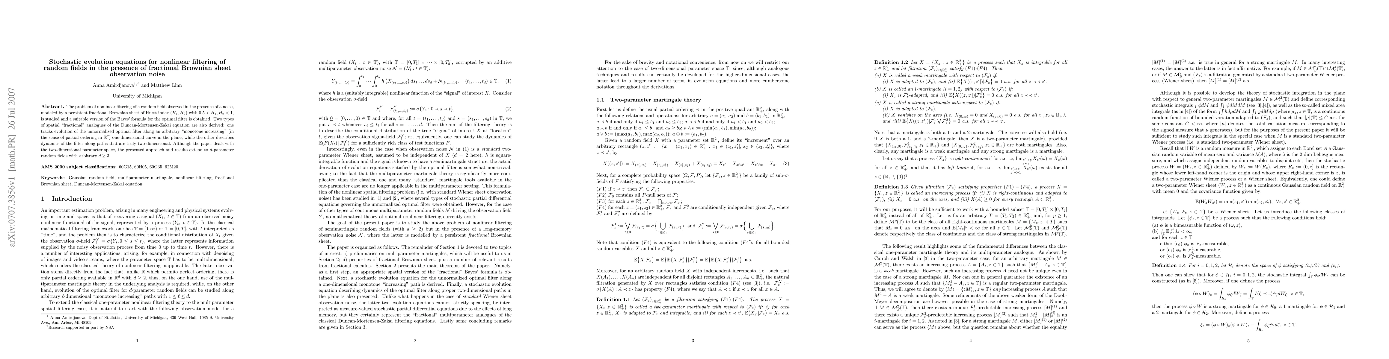 Researchers developed stochastic equations for filtering random fields with fractional Brownian sheet noise, providing a new approach to optimal filtering in high-dimensional spaces.