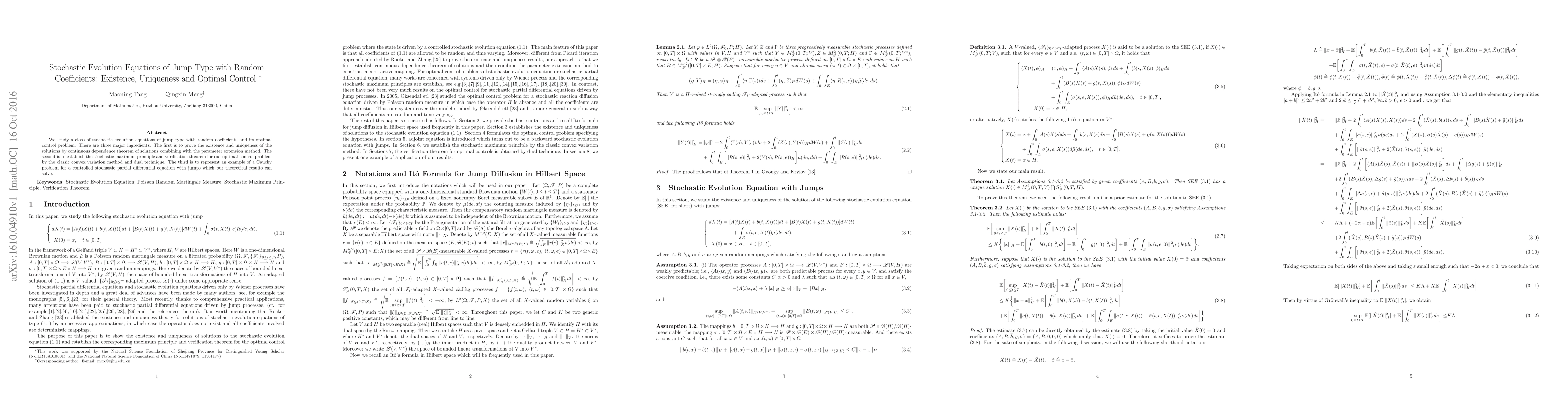 This paper investigates stochastic evolution equations of jump type with random coefficients, proving existence and uniqueness via the continuous dependence theorem and parameter extension method. It also establishes a stochastic maximum principle and verification theorem for the optimal control problem using convex variation and dual techniques.