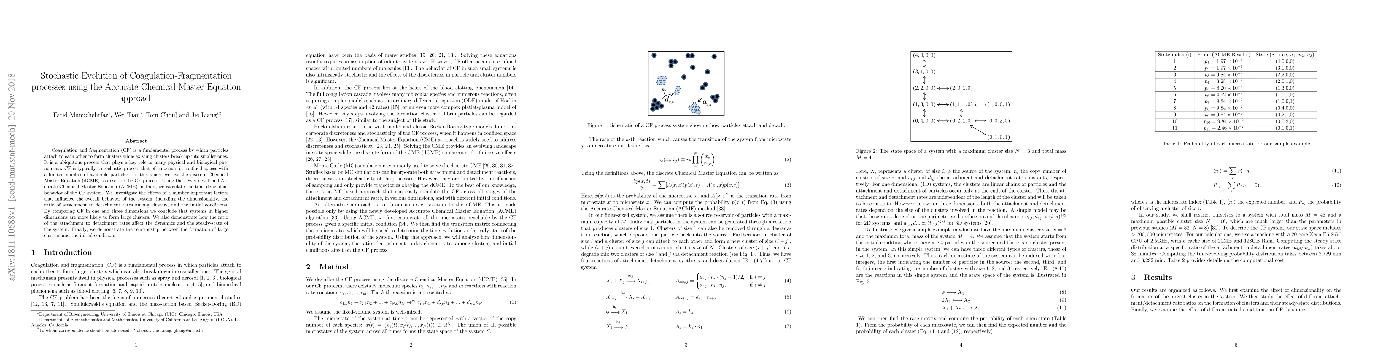 This paper employs the Accurate Chemical Master Equation (ACME) method to study the stochastic evolution of coagulation-fragmentation processes, examining how factors like dimensionality, rate ratios, and initial conditions influence cluster formation dynamics and steady-state behavior. The results show that higher dimensions favor larger cluster formation and that the attachment-to-detachment rate ratio significantly impacts system dynamics.