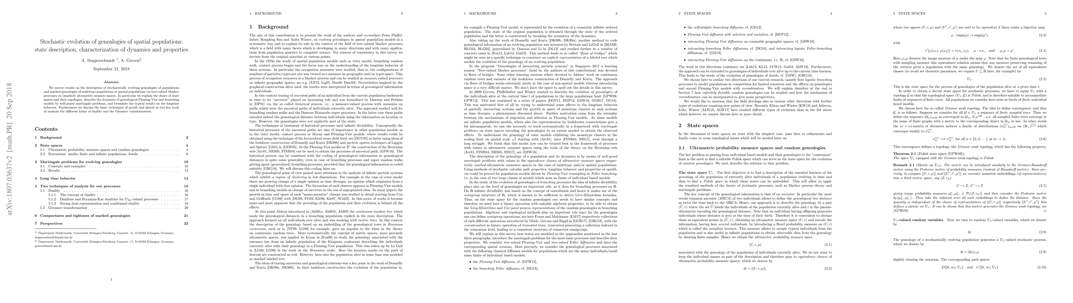 This paper surveys stochastic evolution models for genealogies in spatial populations, focusing on tree-valued Markov processes. It details the state spaces, dynamics, and long-term behavior of genealogical Fleming-Viot and branching models, highlighting key analytical techniques like duality and the Girsanov transformation.