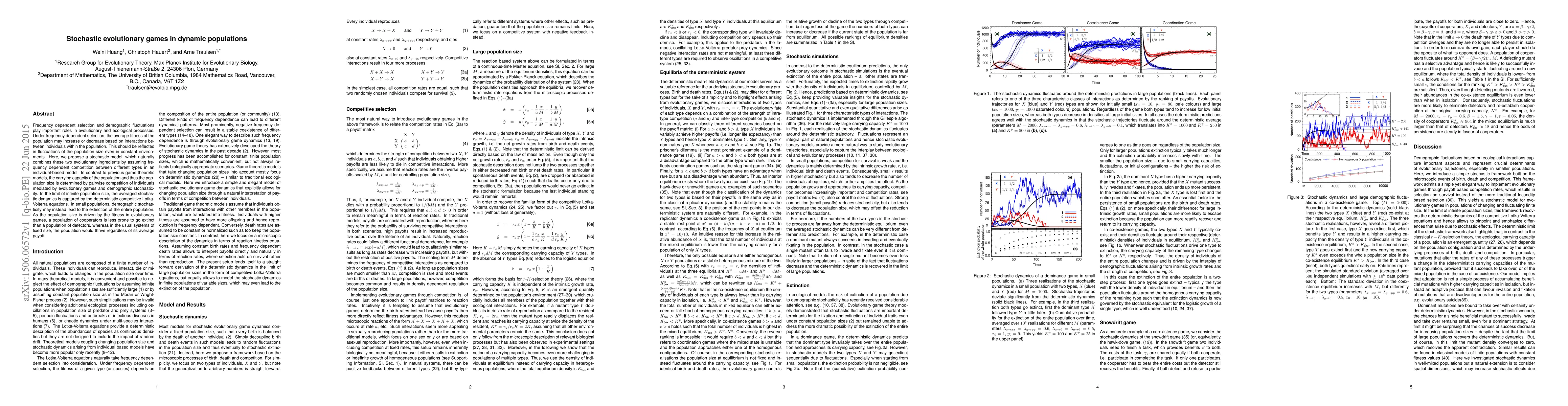 Frequency dependent selection and demographic fluctuations play important roles in evolutionary and ecological processes. Under frequency dependent selection, the average fitness of the population may increase or decrease based on interactions between individuals within the population. This should be reflected in fluctuations of the population size even in constant environments. Here, we propose a stochastic model, which naturally combines these two evolutionary ingredients by assuming frequency dependent competition between different types in an individual-based model. In contrast to previous game theoretic models, the carrying capacity of the population and thus the population size is determined by pairwise competition of individuals mediated by evolutionary games and demographic stochasticity. In the limit of infinite population size, the averaged stochastic dynamics is captured by the deterministic competitive Lotka-Volterra equations. In small populations, demographic stochasticity may instead lead to the extinction of the entire population. As the population size is driven by the fitness in evolutionary games, a population of cooperators is less prone to go extinct than a population of defectors, whereas in the usual systems of fixed size, the population would thrive regardless of its average payoff.