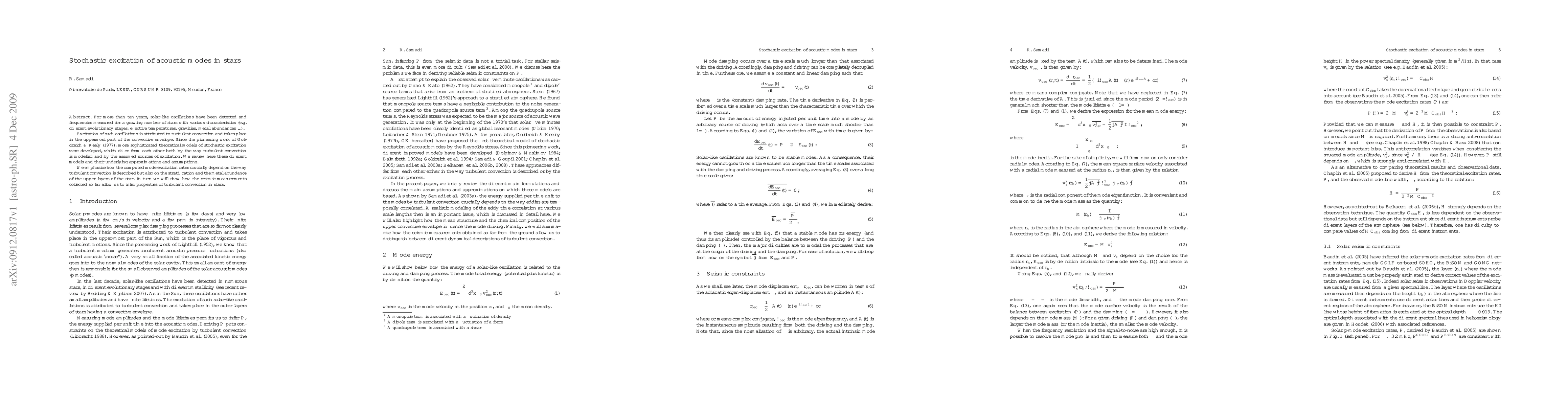 Researchers review stochastic excitation models of acoustic modes in stars, highlighting how turbulent convection properties affect mode excitation rates, and how seismic measurements can inform these properties.