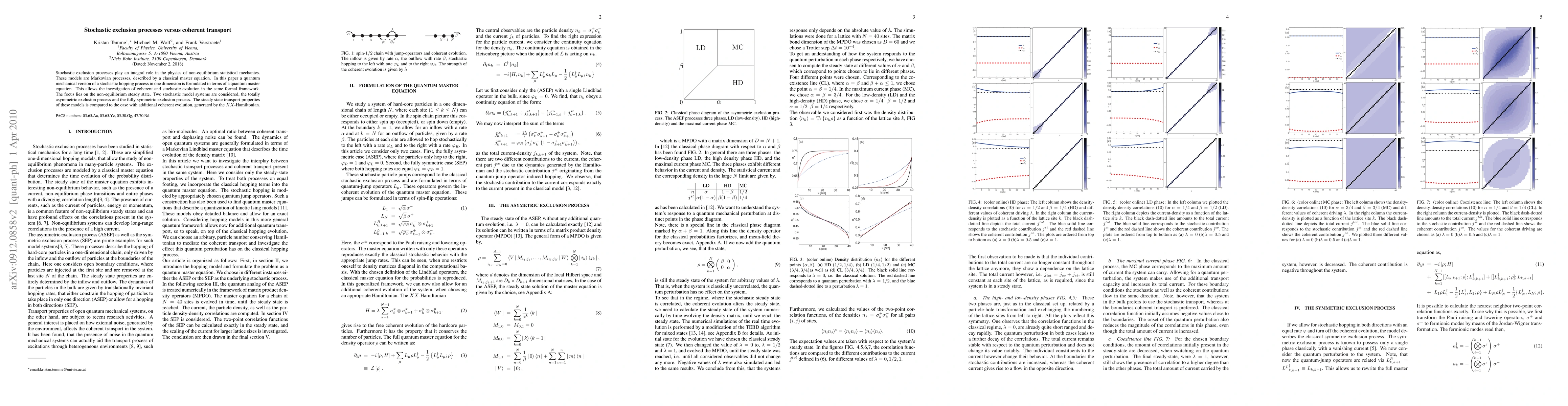 Stochastic exclusion processes play an integral role in the physics of non-equilibrium statistical mechanics. These models are Markovian processes, described by a classical master equation. In this paper a quantum mechanical version of a stochastic hopping process in one dimension is formulated in terms of a quantum master equation. This allows the investigation of coherent and stochastic evolution in the same formal framework. The focus lies on the non-equilibrium steady state. Two stochastic model systems are considered, the totally asymmetric exclusion process and the fully symmetric exclusion process. The steady state transport properties of these models is compared to the case with additional coherent evolution, generated by the $XX$-Hamiltonian.