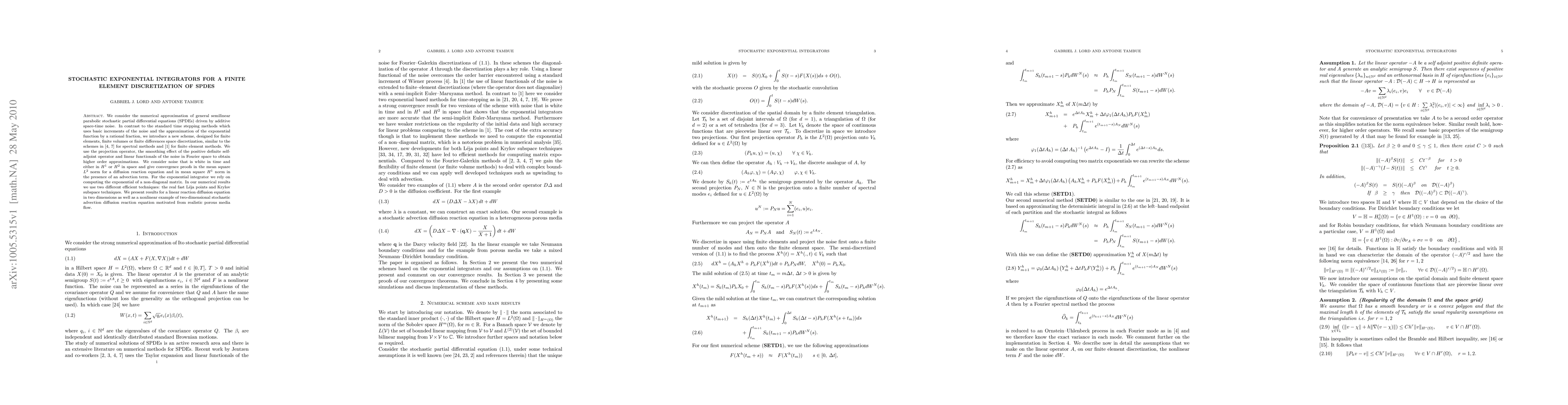 We consider the numerical approximation of general semilinear parabolic stochastic partial differential equations (SPDEs) driven by additive space-time noise. In contrast to the standard time stepping methods which uses basic increments of the noise and the approximation of the exponential function by a rational fraction, we introduce a new scheme, designed for finite elements, finite volumes or finite differences space discretization, similar to the schemes in \cite{Jentzen3,Jentzen4} for spectral methods and \cite{GTambue} for finite element methods. We use the projection operator, the smoothing effect of the positive definite self-adjoint operator and linear functionals of the noise in Fourier space to obtain higher order approximations. We consider noise that is white in time and either in $H^1$ or $H^2$ in space and give convergence proofs in the mean square $L^{2}$ norm for a diffusion reaction equation and in mean square $ H^{1}$ norm in the presence of an advection term. For the exponential integrator we rely on computing the exponential of a non-diagonal matrix. In our numerical results we use two different efficient techniques: the real fast \Leja points and Krylov subspace techniques. We present results for a linear reaction diffusion equation in two dimensions as well as a nonlinear example of two-dimensional stochastic advection diffusion reaction equation motivated from realistic porous media flow.
