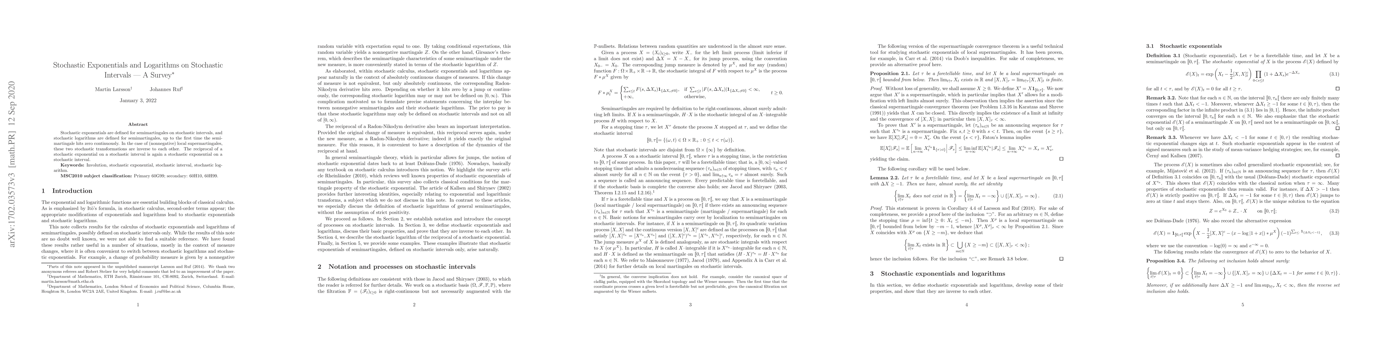 Stochastic exponentials and logarithms defined for semimartingales on stochastic intervals have inverse properties for nonnegative local supermartingales, allowing for reciprocal transformations between the two.