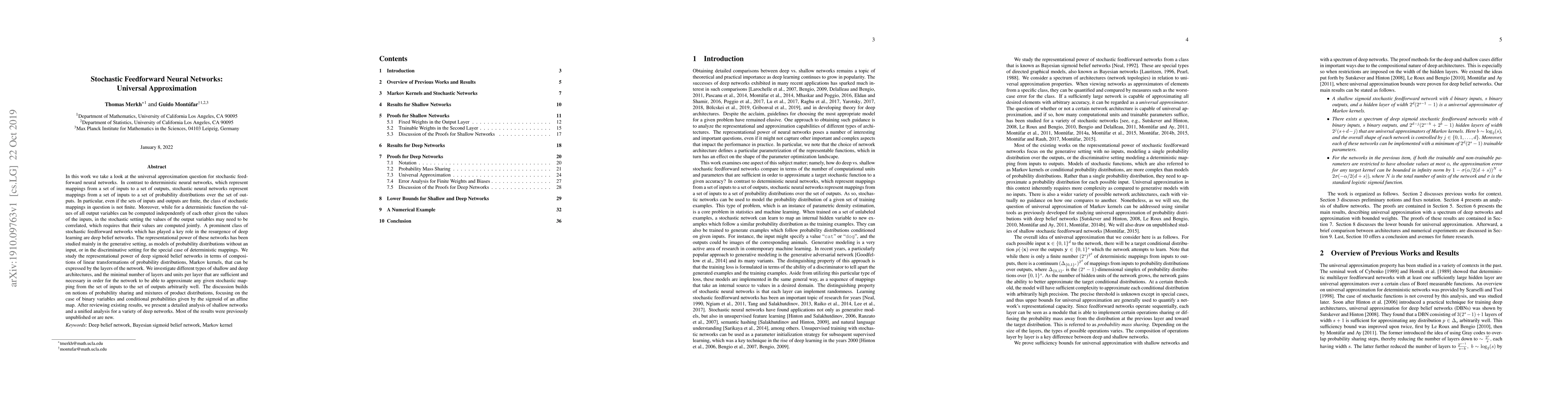 This paper explores the universal approximation capabilities of stochastic feedforward neural networks, focusing on their ability to represent mappings from inputs to probability distributions over outputs. It investigates the minimal network architecture required to approximate any given stochastic mapping, contrasting with deterministic networks.