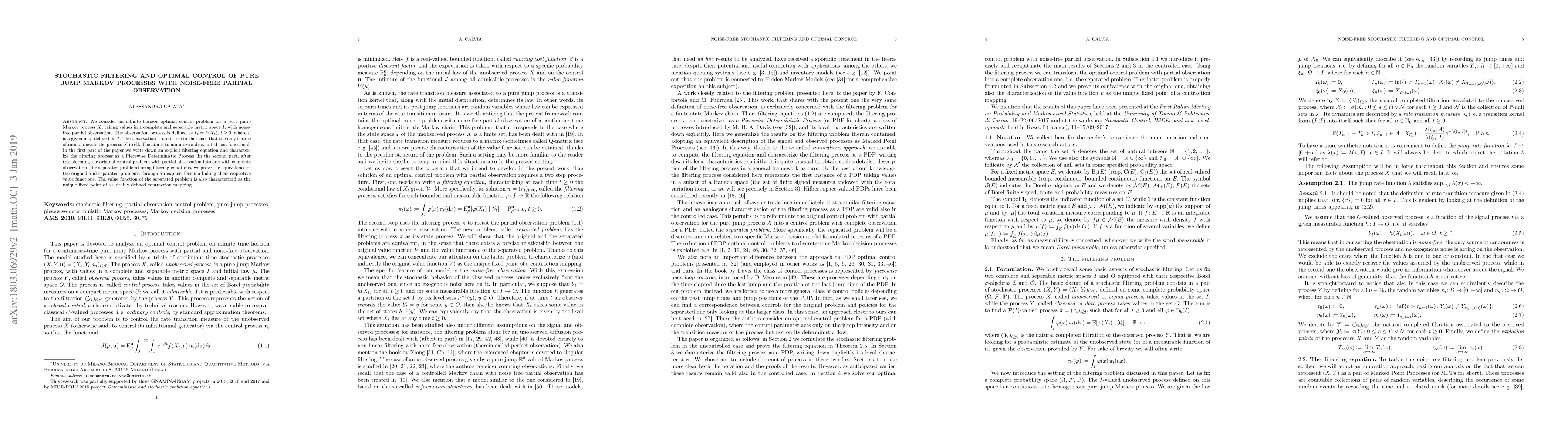 We consider an infinite horizon optimal control problem for a pure jump Markov process $X$, taking values in a complete and separable metric space $I$, with noise-free partial observation. The observation process is defined as $Y_t = h(X_t)$, $t \geq 0$, where $h$ is a given map defined on $I$. The observation is noise-free in the sense that the only source of randomness is the process $X$ itself. The aim is to minimize a discounted cost functional. In the first part of the paper we write down an explicit filtering equation and characterize the filtering process as a Piecewise Deterministic Process. In the second part, after transforming the original control problem with partial observation into one with complete observation (the separated problem) using filtering equations, we prove the equivalence of the original and separated problems through an explicit formula linking their respective value functions. The value function of the separated problem is also characterized as the unique fixed point of a suitably defined contraction mapping.
