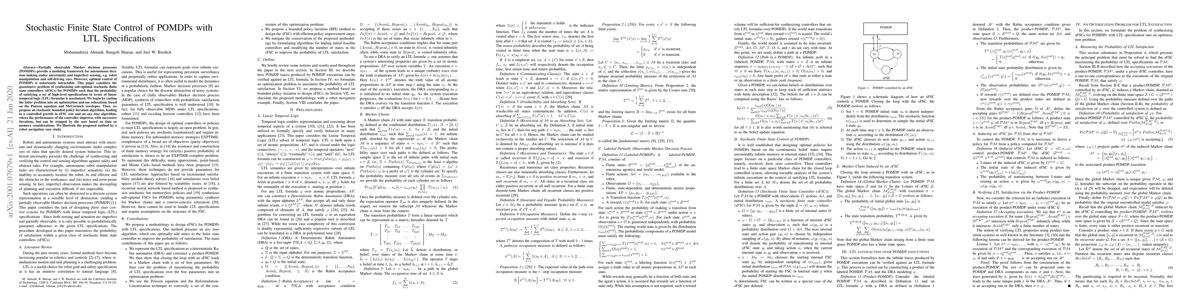 This paper develops a method for synthesizing sub-optimal stochastic finite state controllers for POMDPs to maximize the probability of satisfying high-level LTL specifications. It employs optimization techniques and a bounded policy iteration algorithm to manage controller size and performance improvements over iterations.