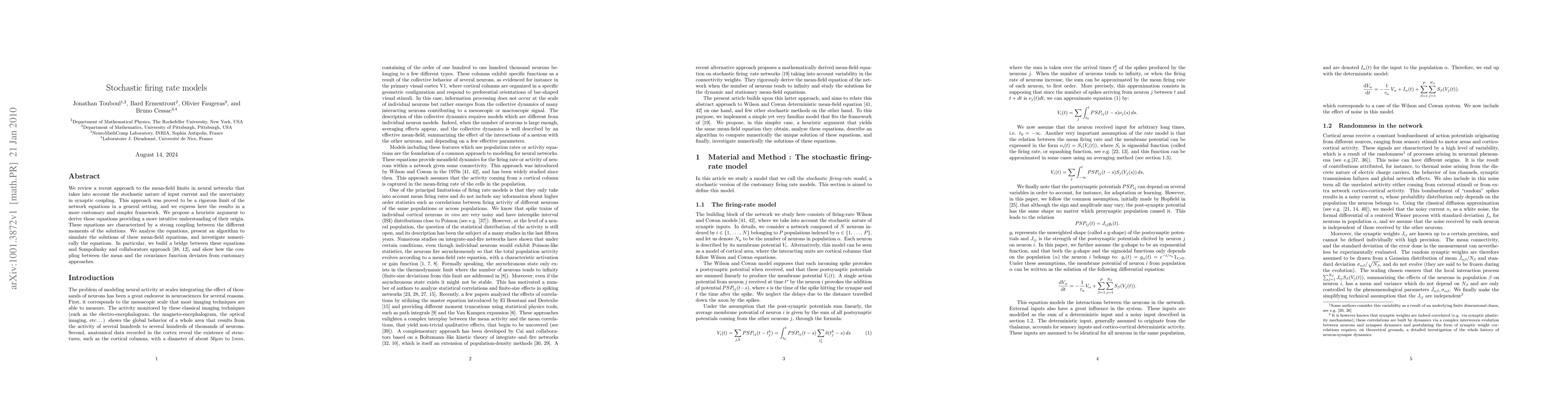 This paper reviews a rigorous mean-field limit approach for neural networks, considering stochastic input current and synaptic coupling uncertainties. It presents a simplified framework, a heuristic argument for deriving these equations, and an algorithm for simulating their solutions, highlighting connections to previous work by Sompolinsky et al. (1988, 1990) while revealing unique coupling characteristics between mean and covariance functions.