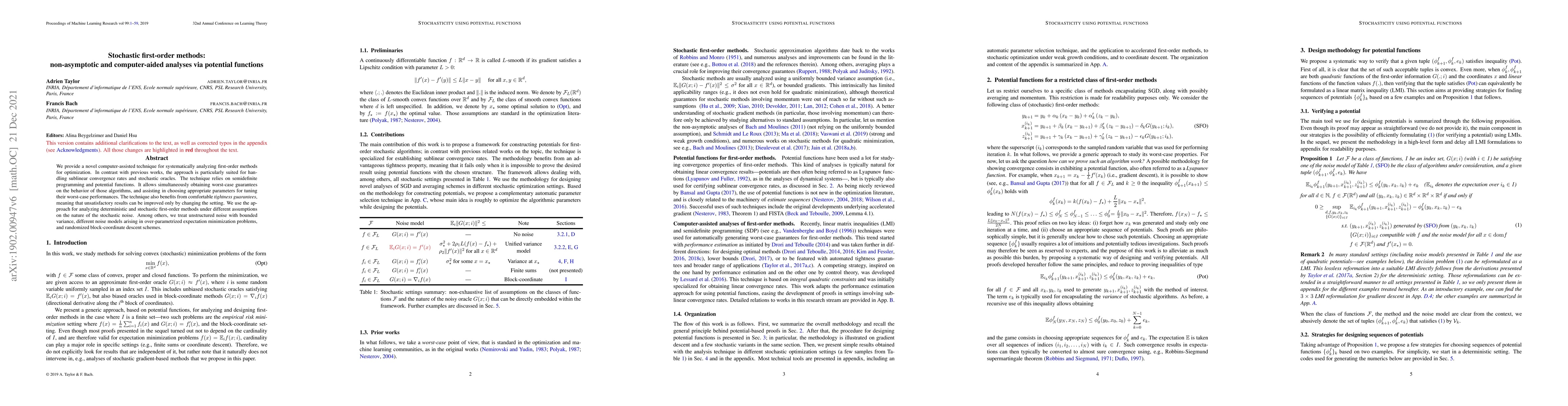 We provide a novel computer-assisted technique for systematically analyzing first-order methods for optimization. In contrast with previous works, the approach is particularly suited for handling sublinear convergence rates and stochastic oracles. The technique relies on semidefinite programming and potential functions. It allows simultaneously obtaining worst-case guarantees on the behavior of those algorithms, and assisting in choosing appropriate parameters for tuning their worst-case performances. The technique also benefits from comfortable tightness guarantees, meaning that unsatisfactory results can be improved only by changing the setting. We use the approach for analyzing deterministic and stochastic first-order methods under different assumptions on the nature of the stochastic noise. Among others, we treat unstructured noise with bounded variance, different noise models arising in over-parametrized expectation minimization problems, and randomized block-coordinate descent schemes.