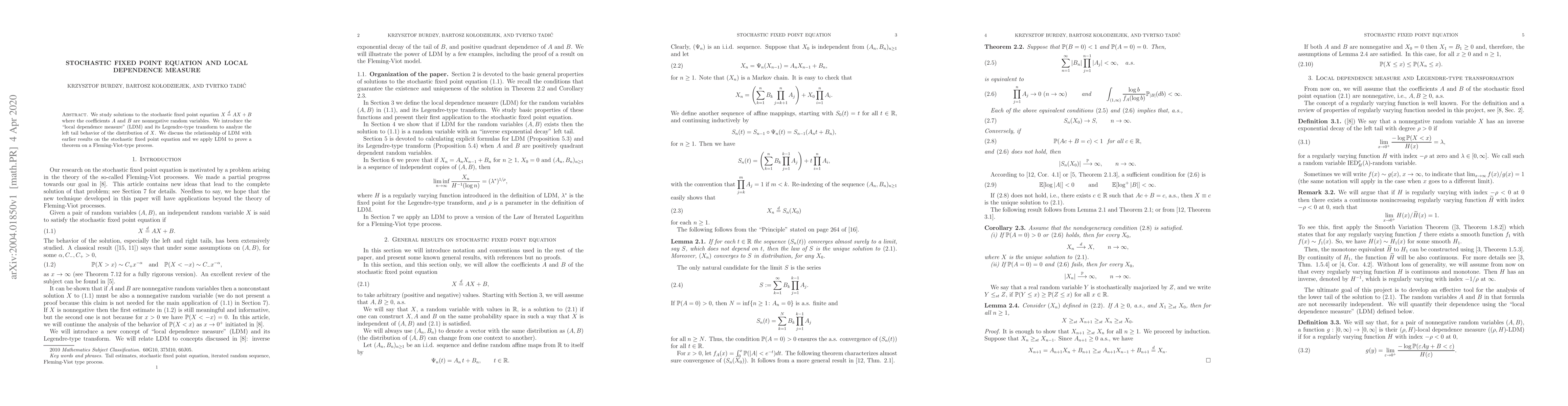 This paper investigates solutions to the stochastic fixed point equation $X\stackrel{d}{=}AX+B$ with random coefficients $A$ and $B$, introducing a "local dependence measure" (LDM) to analyze the left tail behavior of $X$'s distribution and applying it to prove a theorem on a Fleming-Viot-type process.