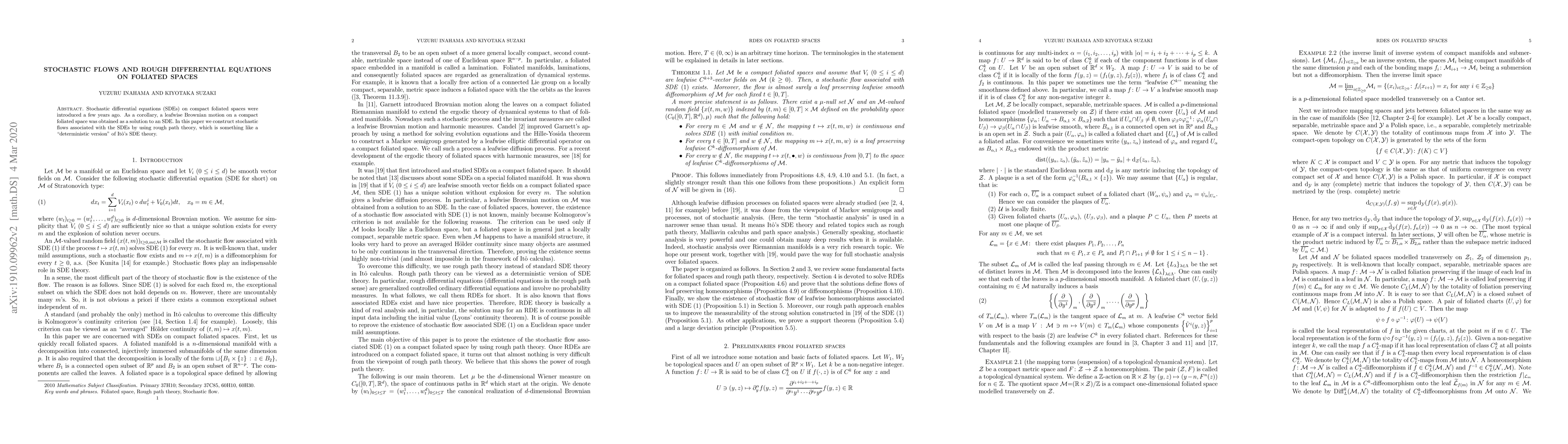 Stochastic differential equations (SDEs) on compact foliated spaces were introduced a few years ago. As a corollary, a leafwise Brownian motion on a compact foliated space was obtained as a solution to an SDE. In this paper we construct stochastic flows associated with the SDEs by using rough path theory, which is something like a "deterministic version" of It\^o's SDE theory.