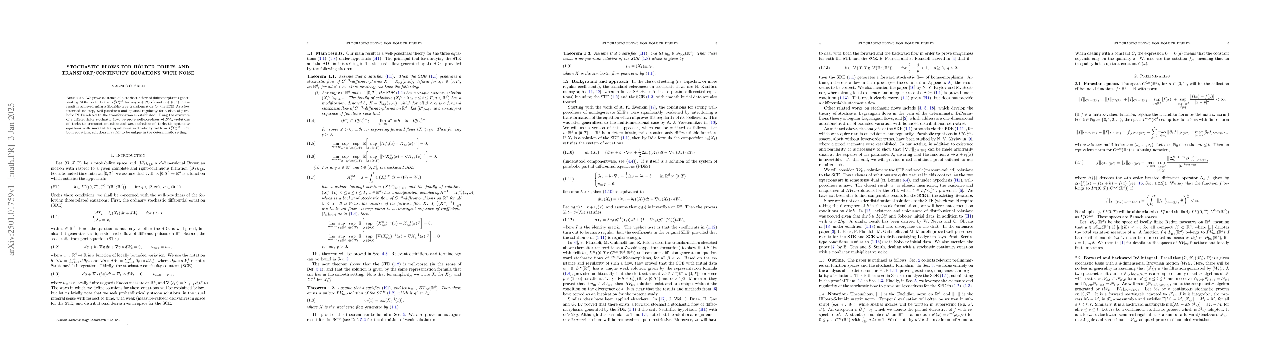 This paper proves the existence of a stochastic flow of diffeomorphisms driven by stochastic differential equations (SDEs) with Hölder drifts and establishes well-posedness for stochastic transport and continuity equations under transport noise. The result leverages a Zvonkin-type transformation and optimal regularity for related parabolic PDEs.