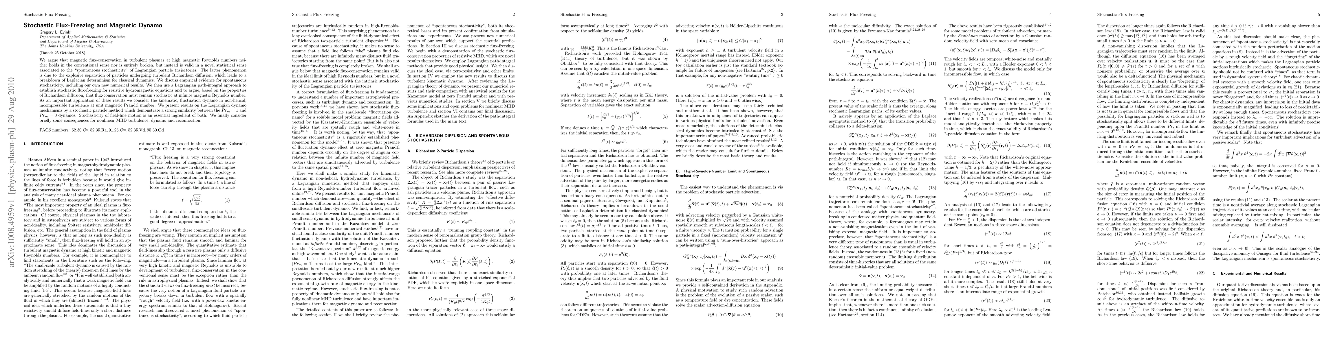 This paper explores the concept of magnetic flux-conservation in turbulent plasmas, proposing that it holds in a statistical, stochastic sense due to the spontaneous randomness in particle trajectories. It uses a Lagrangian path-integral approach to establish stochastic flux-freezing and discusses its implications for kinematic dynamos and nonlinear MHD turbulence.