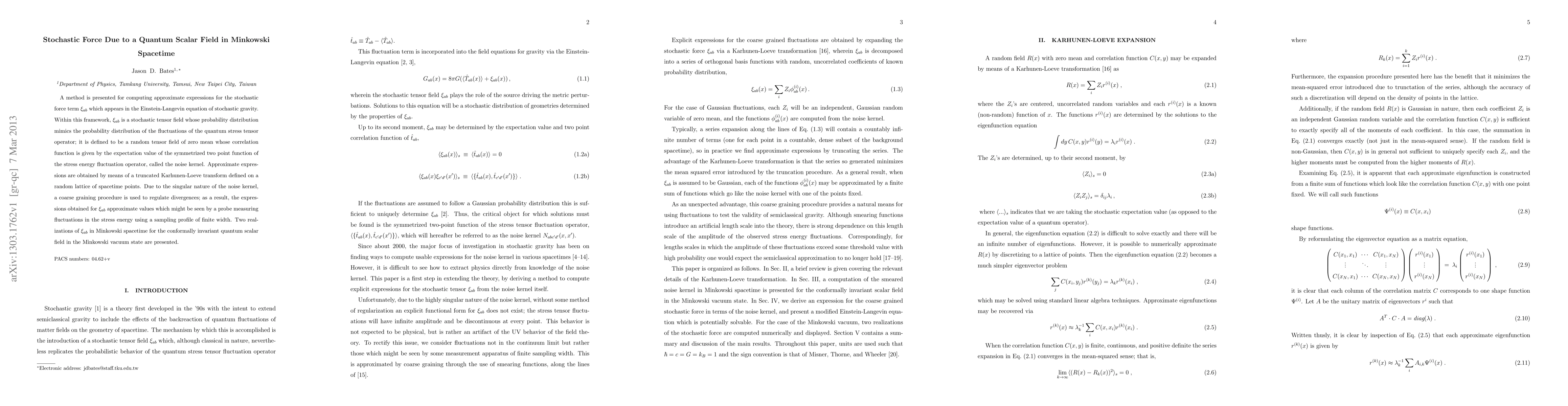 This paper develops a method to compute the stochastic force $\xi_{ab}$ in the Einstein-Langevin equation of stochastic gravity, using a truncated Karhunen-Loeve transform and coarse graining to handle divergences. Two realizations of $\xi_{ab}$ in Minkowski spacetime for a conformally invariant quantum scalar field are provided.