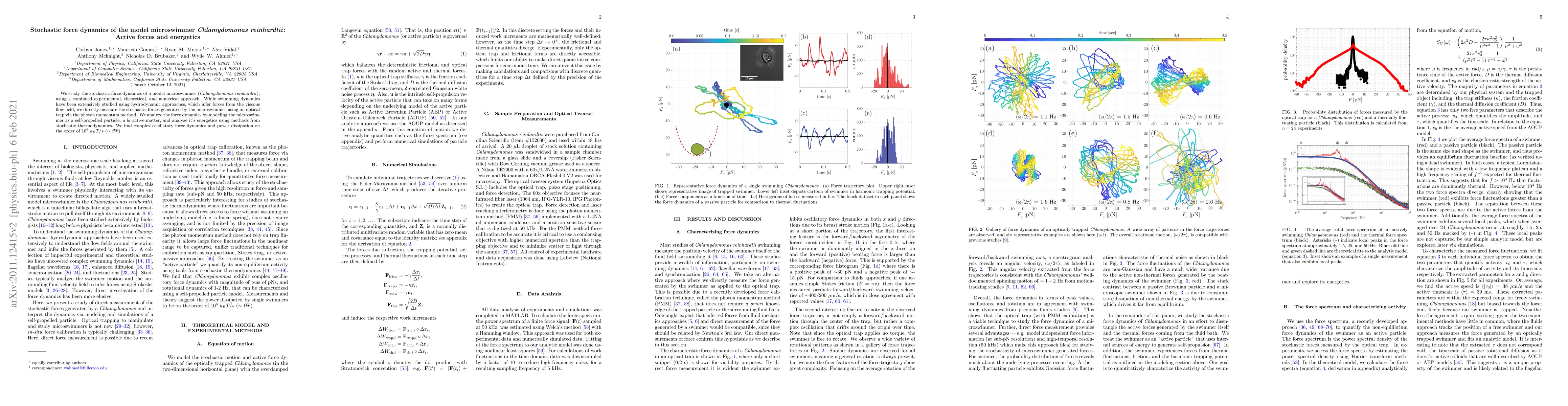This paper investigates the stochastic force dynamics of the microswimmer Chlamydomonas reinhardtii using an optical trap, revealing complex oscillatory forces and high power dissipation of approximately fW, employing a combination of experimental, theoretical, and numerical methods. The study models the microswimmer as an active self-propelled particle and applies stochastic thermodynamics to analyze its energetics.