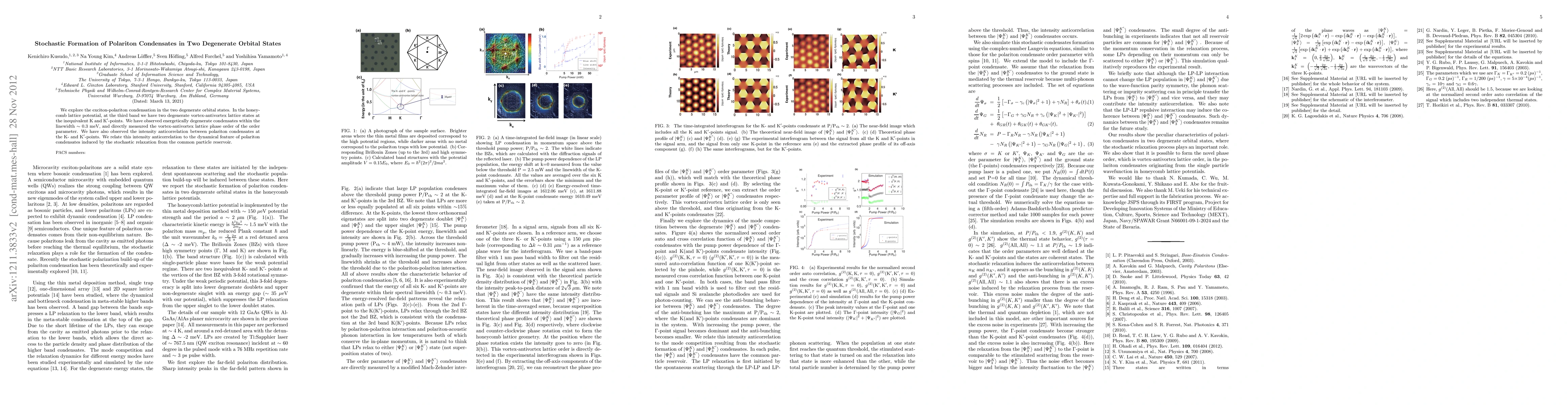 This study investigates exciton-polariton condensation in two degenerate orbital states within a honeycomb lattice potential, revealing energetically degenerate condensates and vortex-antivortex lattice phase order. The observed intensity anticorrelation between K- and K'-point condensates is linked to stochastic relaxation from a common particle reservoir.